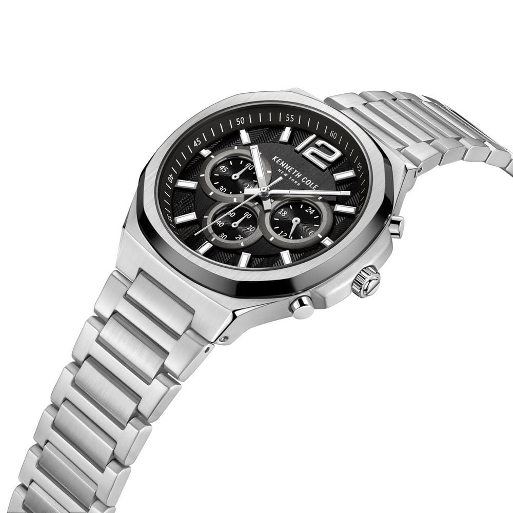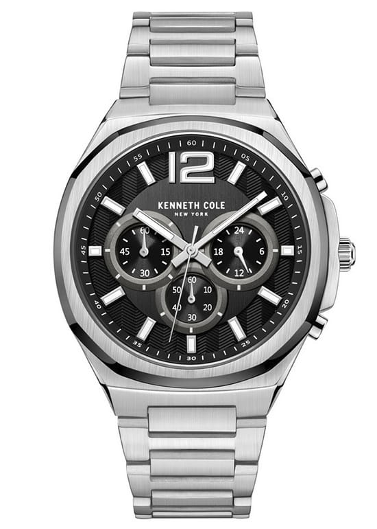Мужские кварцевые часы-хронографХронографФункция позволяет измерять отрезки времени с особой точностью: часы, минуты, секунды. Верным признаком хронографа является наличие на циферблате 3 дополнительных окошек-счётчиков. с секундомеромСекундомерСекундоме́р — прибор, способный измерять интервалы времени с точностью до долей секунды. Kenneth Cole Dress Sport KCWGK2218601, кварцевый механизм с высокой точностью. Минеральное стеклоМинеральное стеклоМинеральное стекло представляет собой искусственно выращенный минерал кварца. Такое стекло отличается особой устойчивостью к повреждениям и царапинам. Уступает по некоторым качествам сапфировому стеклу. устойчивое к появлению царапин, обладающее высокой прозрачностью. Класс водозащиты: 30 метров, позволит защитить корпус от случайных брызг или капель дождя. Корпус и безельБезельВнешний ободок, закрепляющий стекло. В спортивных часах так называется поворотное кольцо с делениями на циферблате, выполняет роль таймера – замеряет отрезки времени на шкале. Неподвижный безель – элемент декора. Однонаправленно вращающийся безель на дайверских часах позволяет фиксировать моменты погружения и выныривания на поверхность. изготовлены из нержавеющей стали. Индикация даты и дня недели. Стрелки и метки с люминесцентным покрытиемЛюминесцентное покрытиеПозволяет считывать показания времени в темноте. Производители наносят на стрелки, часовые индексы, безель или поверхность циферблата светонакопительный состав, дающий холодное свечение.. Браслет из стали с раскладной застёжкойРаскладная застёжкаТакой тип застёжки используется только на браслетах из металла. Она никогда не раскрывается полностью, происходит разделение на 2 и более частей. Раскладывающая застёжка снизит вероятность потери часов к минимуму..