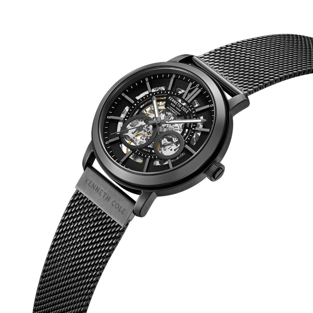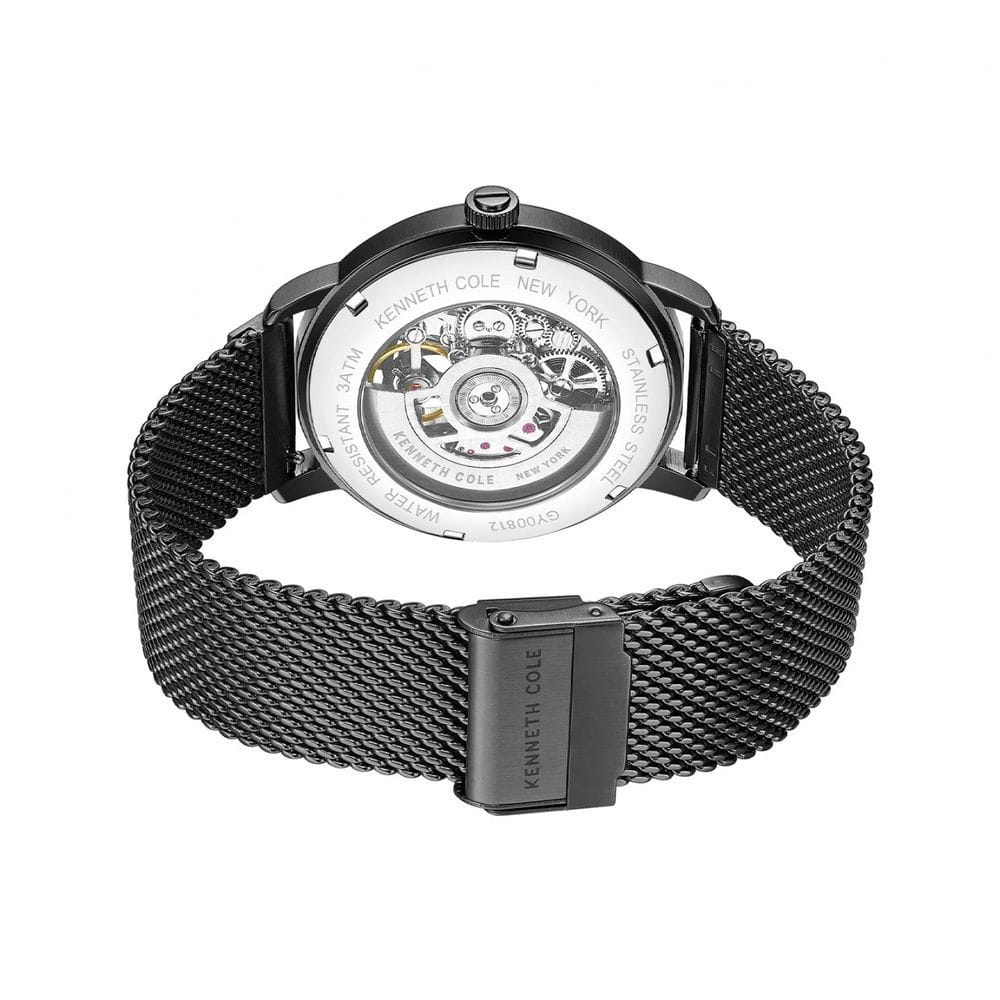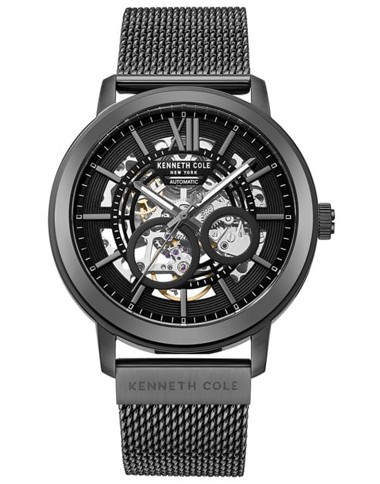 Kenneth Cole KCWGY0081201 — мужская автоматическая модель с эффектным современным дизайном и открытым скелетонизированным циферблатом. Корпус выполнен из нержавеющей стали с PVD-покрытиемPVDУльтратонкое покрытие наносится в технике вакуумного напыления, сочетает в себе нитрид титана особой прочности со слоем золота или оксида хрома. Несёт в себе декоративную или защитную функцию. и дополнен металлическим браслетом в стиле «миланская сетка», который обеспечивает комфортное прилегание и оснащён раскладным замкомРаскладной замокДанный вариант застежки используется только на часах с металлическим браслетом. Отличительная особенность такого крепления в том, что длина браслета становится универсальной и вы можете самостоятельно отрегулировать нужный вам размер – застежка просто двигается по браслету часов. для удобной фиксации. Конструкция циферблата открывает вид на работу автоматического механизма, позволяя наблюдать за его движением. Cтрелки покрыты люминесцентным покрытиемЛюминесцентное покрытиеПозволяет считывать показания времени в темноте. Производители наносят на стрелки, часовые индексы, безель или поверхность циферблата светонакопительный состав, дающий холодное свечение. для читаемости в условиях недостаточного освещения. Защитную функцию выполняет минеральное стеклоМинеральное стеклоМинеральное стекло представляет собой искусственно выращенный минерал кварца. Такое стекло отличается особой устойчивостью к повреждениям и царапинам. Уступает по некоторым качествам сапфировому стеклу., устойчивое к повседневным повреждениям. Водозащита 3 ATM защищает модель от случайных брызг и дождя.