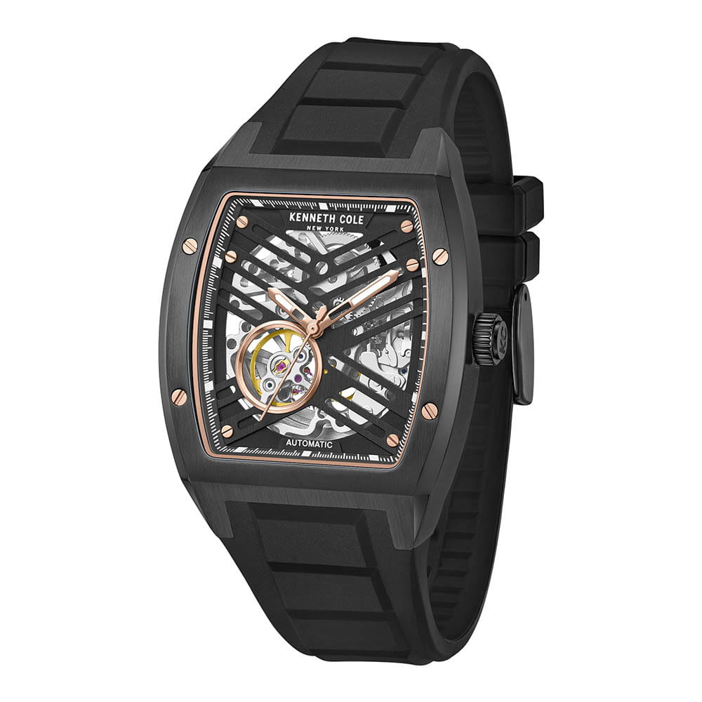 Мужские механические часы с автоподзаводом Kenneth Cole KCWGZ0046103 — это стильный и современный аксессуар с выразительным дизайном. Корпус прямоугольной формы (бочка) размером 40 × 52,5 мм выполнен из стали с IP-покрытиемIP-покрытиеМетод ионного напыления. Демонстрирует повышенную устойчивость к истиранию, окислению и химическим веществам. Под воздействием высокого давления и температуры около 1500°C молекулы металла надёжно соединяются с частицами корпуса часов. чёрного цвета. Циферблат чёрного цвета частично скелетонизирован, что позволяет наблюдать за работой механизма. Циферблат защищён минеральным стекломМинеральное стеклоМинеральное стекло представляет собой искусственно выращенный минерал кварца. Такое стекло отличается особой устойчивостью к повреждениям и царапинам. Уступает по некоторым качествам сапфировому стеклу. и оформлен метками в виде штрихов. Стрелки с люминесцентным покрытиемЛюминесцентное покрытиеПозволяет считывать показания времени в темноте. Производители наносят на стрелки, часовые индексы, безель или поверхность циферблата светонакопительный состав, дающий холодное свечение. обеспечивают хорошую читаемость в темноте. Часы оснащены силиконовым ремешком чёрного цвета с классической пряжкой. Водонепроницаемость 50 м позволяет использовать часы для плавания и повседневного ношения. Сочетание стиля, надёжности и современного дизайна.