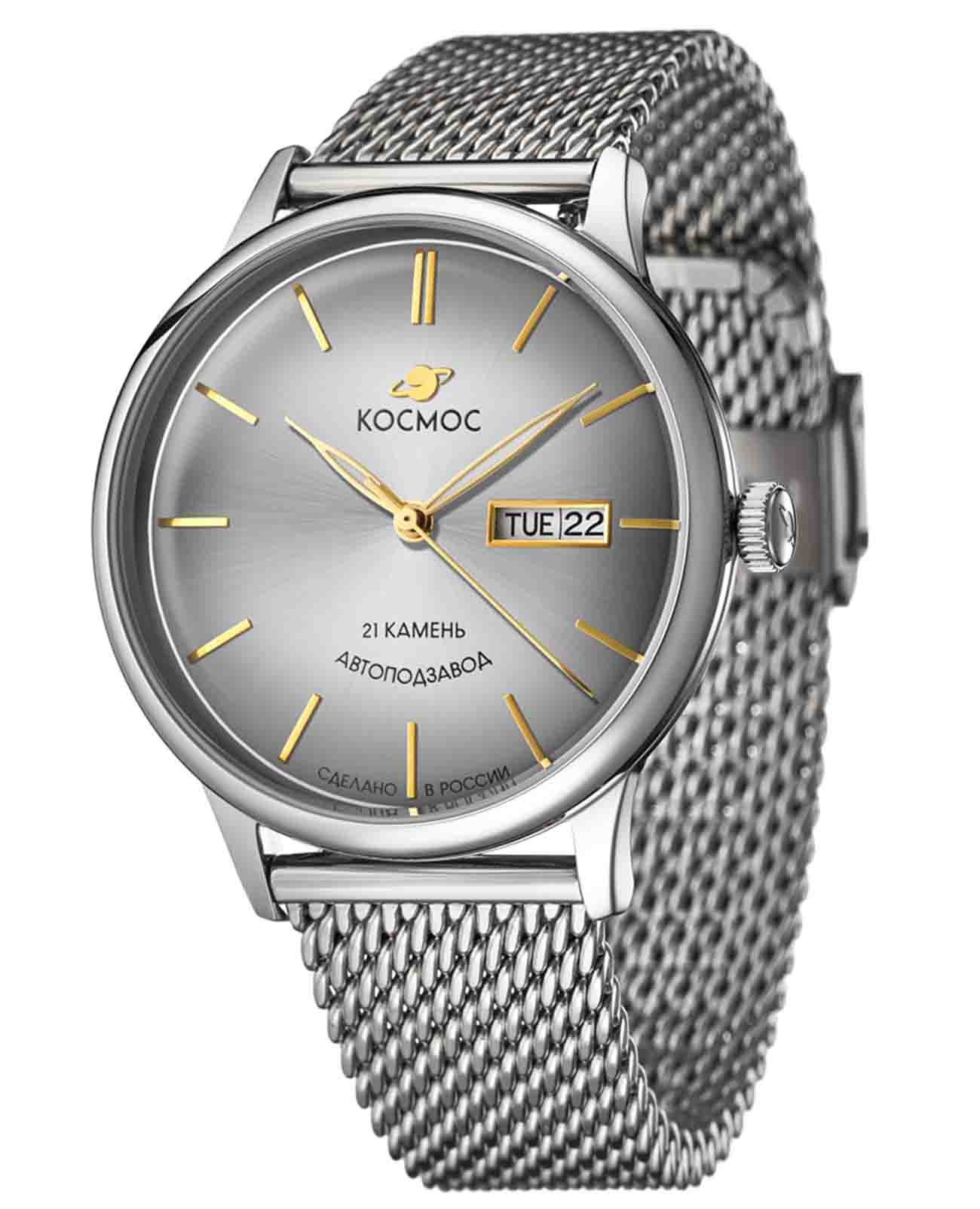Российские мужские механические часы Космос K 043.10.33 с автоподзаводом оснащены корпусом из нержавеющей стали 316L диаметром 41 мм и защищены минеральным стекломМинеральное стеклоМинеральное стекло представляет собой искусственно выращенный минерал кварца. Такое стекло отличается особой устойчивостью к повреждениям и царапинам. Уступает по некоторым качествам сапфировому стеклу.. Дополнен функциями отображения даты и дня недели. Заводная головка декорирована логотипом бренда в виде стилизованного изображения планеты. Часы имеют водонепроницаемость 50 метров, позволит защитить корпус от случайных брызг или капель дождя. Модель комплектуется браслетом из нержавеющей стали 316L с миланским плетением на раскладном замкеРаскладной замокДанный вариант застежки используется только на часах с металлическим браслетом. Отличительная особенность такого крепления в том, что длина браслета становится универсальной и вы можете самостоятельно отрегулировать нужный вам размер – застежка просто двигается по браслету часов.. Специальные крепежи позволяют легко заменить браслет на часах самостоятельно. Прочный корпус и надежный механизм делают эти часы универсальным аксессуаром для повседневного использования. Уникальный дизайн и высокое качество материалов подчеркивают индивидуальность владельца.