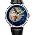 Мужские наручные часы Космос K 043.1 - Юнона — это уникальная модель. Автоматическая межпланетная станция Юнона стала первым космическим аппаратом, который в летний период 2016 года вышел на полярную орбиту Сатурна. Изображение этого газового гиганта занимает центральное место на циферблате часов. Сквозь несколько слоев лака и краски просвечивает тончайший лист фольги, что используется для передачи текстуры поверхности и создания эффекта объема. Процесс постепенной прорисовки деталей довольно длительный: художнику требуется до 50 часов для завершения одного сюжета. Затем миниатюра запекается в специальной печи, что придаёт рисунку необходимую яркость и завершенность. Эти часы созданы в единственном экземпляре. В часах установлен механизм TMI с функцией автоподзавода. Они показывают часы, минуты и секунды, а также дату и день недели, индикатор которых с накладной рамкой расположен в положении «3 часа». За работой механизма можно наблюдать через прозрачную заднюю крышку. Часовая и минутная стрелки c люминесцентным покрытиемЛюминесцентное покрытиеПозволяет считывать показания времени в темноте. Производители наносят на стрелки, часовые индексы, безель или поверхность циферблата светонакопительный состав, дающий холодное свечение., которое светится в темноте. Минеральное стеклоМинеральное стеклоМинеральное стекло представляет собой искусственно выращенный минерал кварца. Такое стекло отличается особой устойчивостью к повреждениям и царапинам. Уступает по некоторым качествам сапфировому стеклу. изготовлено по технологии, характерной для 60-70-х годов прошлого века: оно выпуклое с обеих сторон. Ремешок выполнен из натуральной кожи черного цвета с аккуратной строчкой. Специальное крепление позволяет легко заменить ремешок на аналогичный или на стальной браслет миланского плетения.