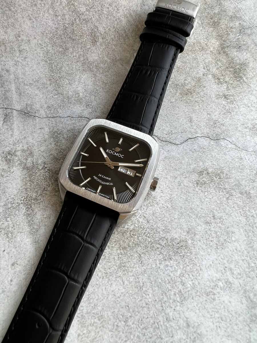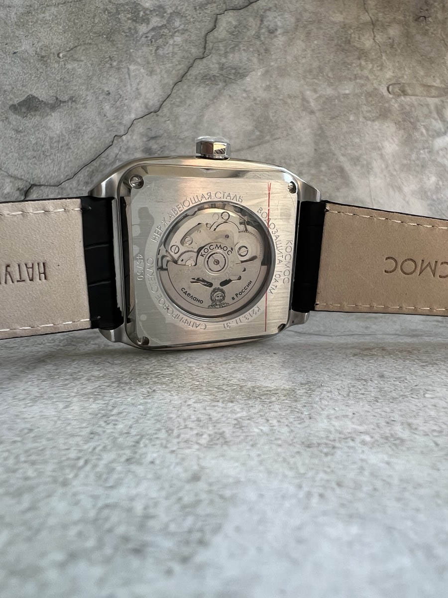 Мужские наручные часы Космос Марсоход K 213.11.31 — это уникальная лимитированная серия, посвященная аппарату, способному передвигаться по поверхности Красной планеты. Марсоход ассоциируется с брутальностью, мастерством и технической сложностью. Наша страна дважды запускала подобные аппараты еще в 70-х годах прошлого века. Дизайн часов серии Марсоход вдохновлен лучшими работами советских мастеров, сочетая современные технологии часового искусства с обаянием стиля ретро. Корпус в форме квадрата с закругленными углами выполнен из нержавеющей стали марки 316L, украшенной зеркальной полировкой и сатинированием. Удобная заводная головка имеет форму гайки, что добавляет модели индустриальный шарм. Задняя крышка прозрачная, закрепленная на четырех винтах, и позволяет увидеть работу механизма TMI с подвижным ротором, на котором гравируется надпись «Сделано в России». Также здесь представлена гравировка с изображением космонавта, придающая часам особую значимость. Водостойкость достигает 10 атм (WR100), что позволяет использовать часы при плавании и других водных видах спорта. На задней крышке указан индивидуальный номер модели в формате от 01/50 до 50/50 (первый выпуск) или от 051/100 до 100/100 (второй выпуск). Объемный циферблат состоит из двух уровней. В центре движутся три стрелки, часовая и минутная из которых имеют люминесцентное покрытиеЛюминесцентное покрытиеПозволяет считывать показания времени в темноте. Производители наносят на стрелки, часовые индексы, безель или поверхность циферблата светонакопительный состав, дающий холодное свечение., позволяющее определять время даже в темноте. Индексы накладные, как и стальная рамка, выделяющая сдвоенное окошко даты и дня недели, где день недели отображается на двух языках — русском и английском. Циферблат защищен прочным сапфировым стеклом с антибликовым покрытиемСапфировое стеклоПрочный и надёжный материал из кристалла сапфира синтетического происхождения, характеризующийся особой твёрдостью и устойчивостью к царапинам и повреждениям., обеспечивающим отличную читаемость показаний в любых условиях. Кожаный ремешок оснащен удобной застёжкой «бабочка» с кнопкамиЗастёжка "бабочка"Такой вид застёжки дополняется предохранителями, помогающими избежать случайного раскрытия браслета. Обладают изящным исполнением. , которая сводит к минимуму вероятность потери. Коллекция Марсоход — идеальный выбор для ценителей истории космических достижений и современных технологий.