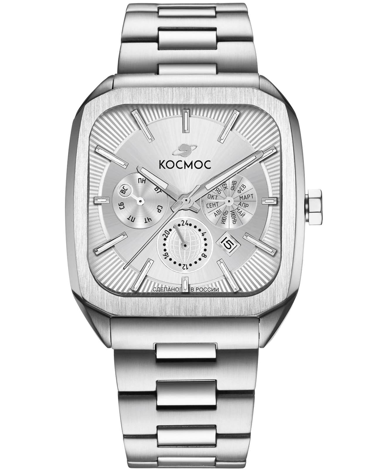 Мужские наручные часы Космос Марсоход II K 219.10.33 — это уникальная лимитированная серия, посвященная аппарату, способному передвигаться по поверхности Красной планеты. Марсоход ассоциируется с брутальностью, мастерством и технической сложностью. Наша страна дважды запускала подобные аппараты еще в 70-х годах прошлого века. Дизайн часов серии Марсоход вдохновлен лучшими работами советских мастеров, сочетая современные технологии часового искусства с обаянием стиля ретро. Корпус в форме квадрата с закругленными углами выполнен из нержавеющей стали украшенной зеркальной полировкой и сатинированием. Удобная заводная головка имеет форму гайки, что добавляет модели индустриальный шарм. Задняя крышка прозрачная, закрепленная на четырех винтах, и позволяет увидеть работу механизма TMI с подвижным ротором, на котором гравируется надпись «Сделано в России». Также здесь представлена гравировка с изображением космонавта, придающая часам особую значимость. Водостойкость достигает 10 атм (WR100), что позволяет использовать часы при плавании и других водных видах спорта. На задней крышке указан индивидуальный номер модели в формате от 01/50 до 50/50. Объемный циферблат состоит из двух уровней. В центре движутся три стрелки, часовая и минутная из которых имеют люминесцентное покрытиеЛюминесцентное покрытиеПозволяет считывать показания времени в темноте. Производители наносят на стрелки, часовые индексы, безель или поверхность циферблата светонакопительный состав, дающий холодное свечение., позволяющее определять время даже в темноте. Также, здесь расположили три дополнительных индикатора: день недели, месяц и время в формате 24-х часов. Для обозначения дня недели и месяца используется кириллица. Окошко даты между 4 и 5 часами выделено накладной рамкой. Циферблат защищен прочным сапфировым стеклом с антибликовым покрытиемСапфировое стеклоПрочный и надёжный материал из кристалла сапфира синтетического происхождения, характеризующийся особой твёрдостью и устойчивостью к царапинам и повреждениям., обеспечивающим отличную читаемость показаний в любых условиях. Второй уровень декорирован гильоше в виде солнечных лучей, на нем закреплены накладные индексы. Браслет изготовлен из литых стальных звеньев нержавеющей стали и оснащен удобной застёжкой «бабочка» с кнопкамиЗастёжка "бабочка"Такой вид застёжки дополняется предохранителями, помогающими избежать случайного раскрытия браслета. Обладают изящным исполнением. , которая сводит к минимуму вероятность потери. Заводная головка, застежка и браслет украшены фирменным логотипом бренда. Коллекция Марсоход — идеальный выбор для ценителей истории космических достижений и современных технологий.