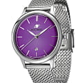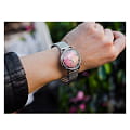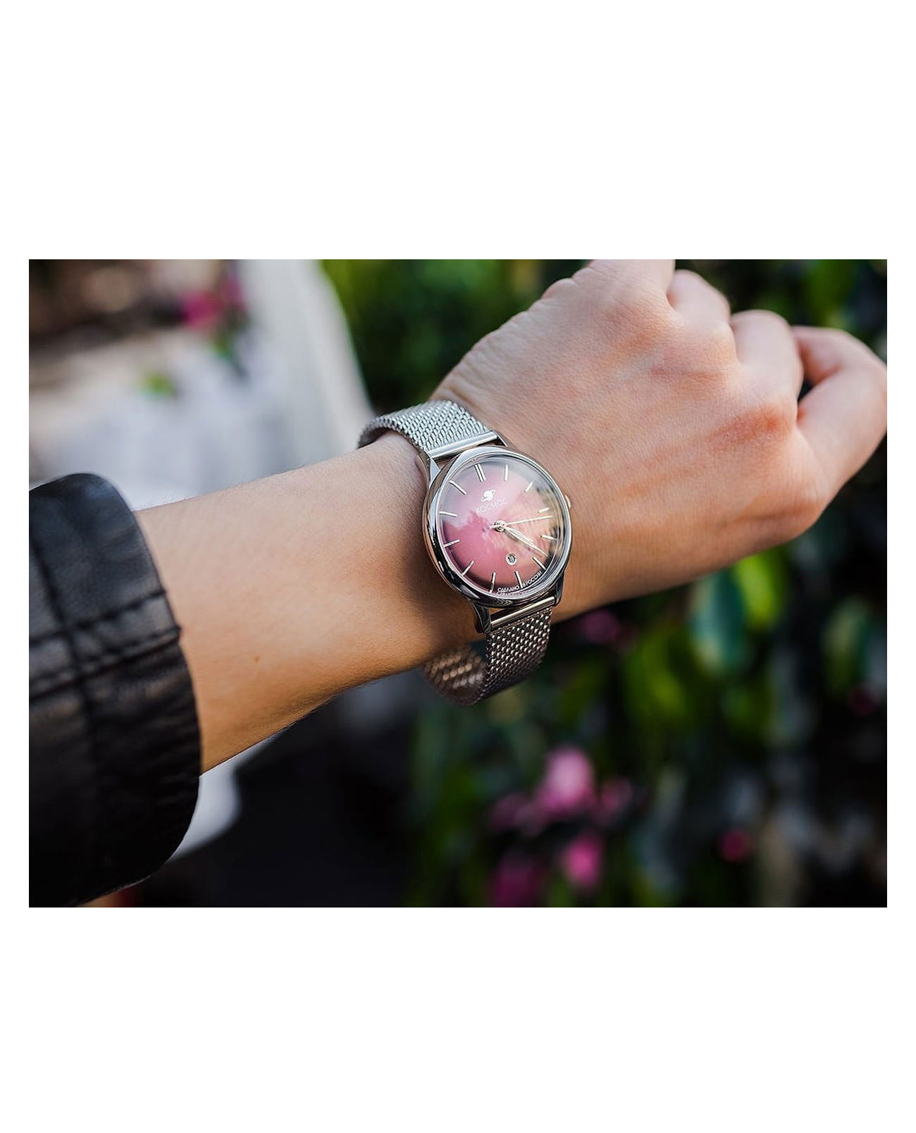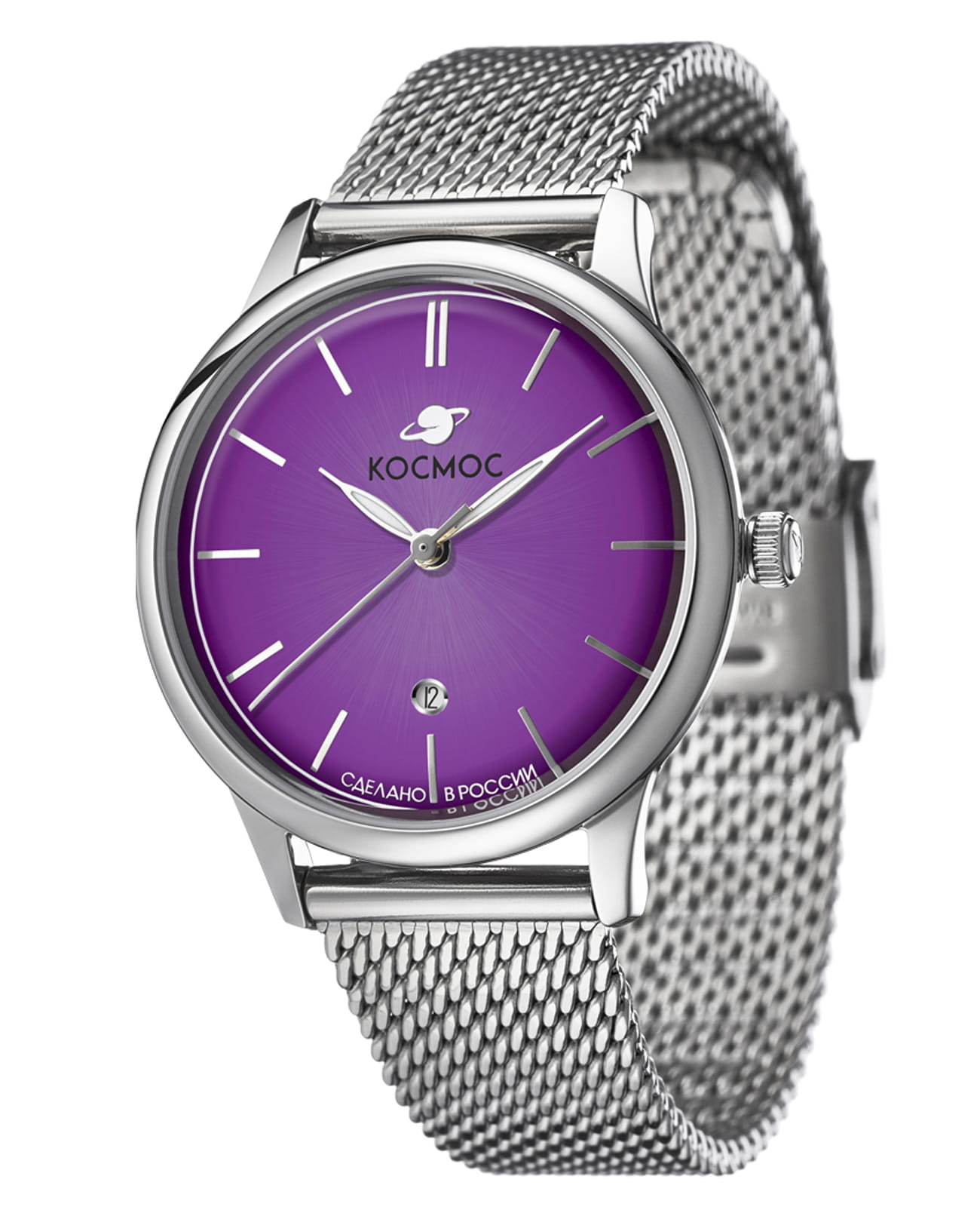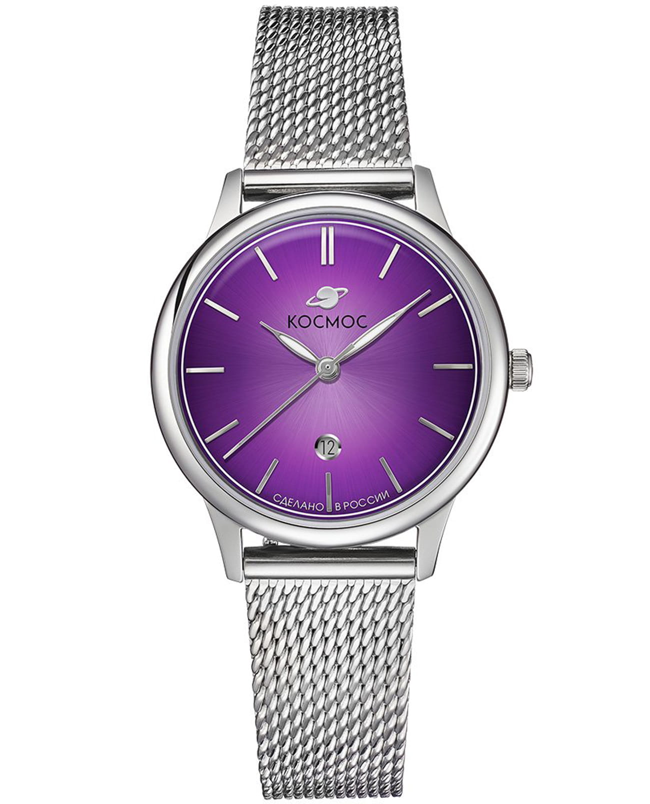 Женские наручные часы Космос Созвездие K 601.10.37 — это сочетание традиций часового искусства 60-70-х годов и футуристического дизайна, вдохновленного космическими исследованиями. Они не только служат напоминанием о прошлом, но и побуждают задуматься о будущем, позволяя наслаждаться качеством и смыслом, вложенными в каждую деталь. Полированный корпус часов выполнен в виде силуэта летающей тарелки благодаря выпуклым формам стекла и нижней части корпуса. Стальные ушки, которые напоминают опоры летающей тарелки, завершает общий образ. На задней крышке часов выгравирован фантазийный сюжет – космическая станция будущего. Название коллекции Созвездие – идеально отражает разнообразие моделей с яркими, но тщательно подобранными цветами. Фиолетовый циферблат выполнен в ретро стиле, с выгнутыми краями, что требует применения сложной производственной технологии. Такой дизайн был характерен для часов прошлых лет. Кончик секундной стрелки также изогнут, следуя форме циферблата. Выпуклый градиентный циферблат украшен шлифовкой в стиле солнечных лучей и ручными индексами, которые фиксируются на двух штифтах. Окошко даты обрамлено стальной рамкой, что добавляет часам утонченности и элегантности. Часовая и минутная стрелки, а также круг по краю циферблата, напоминающий ореол Земли, с люминесцентным покрытиемЛюминесцентное покрытиеПозволяет считывать показания времени в темноте. Производители наносят на стрелки, часовые индексы, безель или поверхность циферблата светонакопительный состав, дающий холодное свечение., которое светится в темноте, создавая завораживающий эффект. Форма минерального стеклаМинеральное стеклоМинеральное стекло представляет собой искусственно выращенный минерал кварца. Такое стекло отличается особой устойчивостью к повреждениям и царапинам. Уступает по некоторым качествам сапфировому стеклу. тщательно продумана: оно выгнуто как снаружи, так и изнутри. Такая конструкция исключает искажения изображения на циферблате, в отличие от обычного стекла. Часы оснащены гибким и прочным браслетом из миланского плетения. Заводная головка, застежка и ремешок украшены фирменным логотипом.