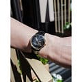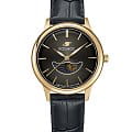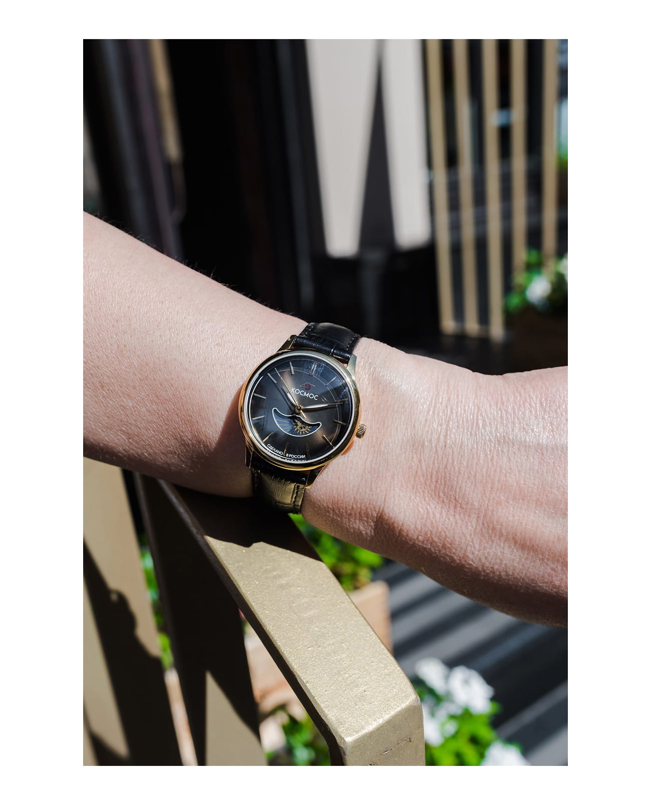 Женские наручные часы Космос Солнце и Луна K 617.21.31 — это сочетание традиций часового искусства 60-70-х годов и футуристического дизайна, вдохновленного космическими исследованиями. Они не только служат напоминанием о прошлом, но и побуждают задуматься о будущем, позволяя наслаждаться качеством и смыслом, вложенными в каждую деталь. Полированный корпус часов выполнен в виде силуэта летающей тарелки благодаря выпуклым формам стекла и нижней части корпуса. Стальные ушки, которые напоминают опоры летающей тарелки, завершает общий образ. На задней крышке часов выгравирован фантазийный сюжет – космическая станция будущего. Элегантные женские часы из серии Солнце и Луна выделяются функцией день/ночь. Черный циферблат выполнен в ретро-стиле с выгнутыми краями, что требует применения сложных технологий в производстве. Циферблаты такой формы были характерны для часов прошлых эпох. Кончик секундной стрелки изогнут в соответствии с формой циферблата. На градиентном выпуклом циферблате выполнена шлифовка в стиле солнечных лучей, а также размещены индексы, изготовленные вручную и закрепленные на двух штифтах. Часовая и минутная стрелки, а также круг по краю циферблата, напоминающий ореол Земли, с люминесцентным покрытиемЛюминесцентное покрытиеПозволяет считывать показания времени в темноте. Производители наносят на стрелки, часовые индексы, безель или поверхность циферблата светонакопительный состав, дающий холодное свечение., которое светится в темноте, создавая завораживающий эффект. Форма минерального стеклаМинеральное стеклоМинеральное стекло представляет собой искусственно выращенный минерал кварца. Такое стекло отличается особой устойчивостью к повреждениям и царапинам. Уступает по некоторым качествам сапфировому стеклу. тщательно продумана: оно выгнуто как снаружи, так и изнутри. Такое решение позволяет избежать искажения изображения на циферблате, в отличие от стекла с прямой внутренней частью, которое создает эффект линзы. Корпус изготовлен из гипоаллергенной стали с IP-покрытиемIP-покрытиеМетод ионного напыления. Демонстрирует повышенную устойчивость к истиранию, окислению и химическим веществам. Под воздействием высокого давления и температуры около 1500°C молекулы металла надёжно соединяются с частицами корпуса часов., что обеспечивает комфорт при ношении. Ремешок модели сделан из натуральной кожи черного цвета. Заводная головка, застежка и ремешок украшены фирменным логотипом.