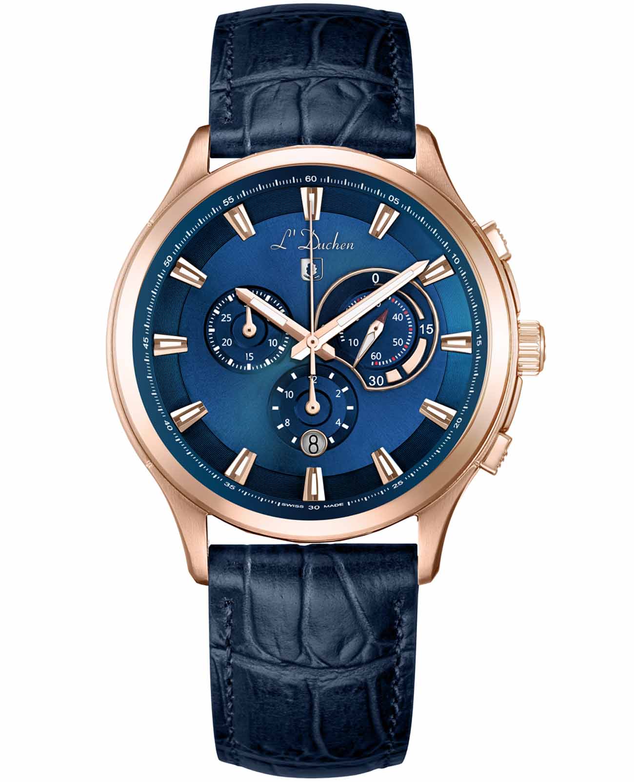 Мужские швейцарские часы- хронографХронографФункция позволяет измерять отрезки времени с особой точностью: часы, минуты, секунды. Верным признаком хронографа является наличие на циферблате 3 дополнительных окошек-счётчиков. L'Duchen Pilotage D 742.43.37, кварцевый механизм с высокой точностью. Сапфировое стеклоСапфировое стеклоПрочный и надёжный материал из кристалла сапфира синтетического происхождения, характеризующийся особой твёрдостью и устойчивостью к царапинам и повреждениям. устойчивое к появлению царапин, обладающее высокой прозрачностью. Корпус часов выполнен из нержавеющей стали с PVD-покрытиемPVDУльтратонкое покрытие наносится в технике вакуумного напыления, сочетает в себе нитрид титана особой прочности со слоем золота или оксида хрома. Несёт в себе декоративную или защитную функцию.. Стрелки с люминесцентным покрытиемЛюминесцентное покрытиеПозволяет считывать показания времени в темноте. Производители наносят на стрелки, часовые индексы, безель или поверхность циферблата светонакопительный состав, дающий холодное свечение.. Класс водозащиты: 100 метров, позволит плавать, нырять и заниматься другими водными видами спорта. Кожаный ремешок на застёжке «бабочка» с кнопкамиЗастёжка "бабочка"Такой вид застёжки дополняется предохранителями, помогающими избежать случайного раскрытия браслета. Обладают изящным исполнением. .