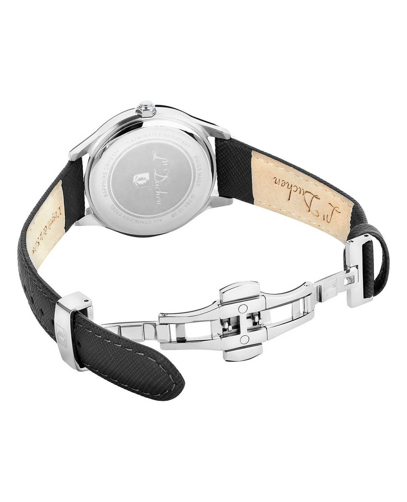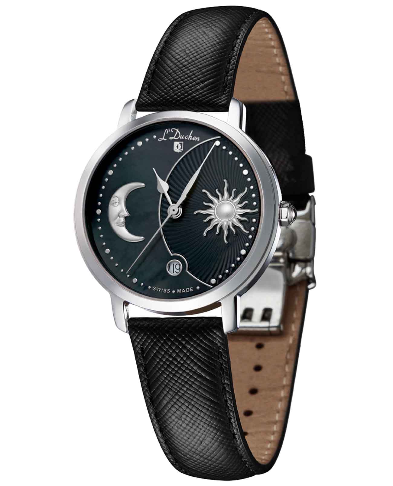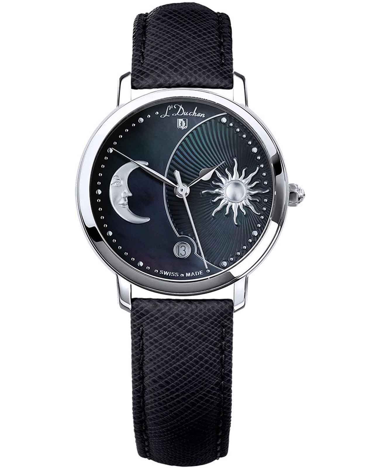Женские швейцарские часы L'Duchen Day & Night D 781.11.31, кварцевый механизм с высокой точностью. Сапфировое стеклоСапфировое стеклоПрочный и надёжный материал из кристалла сапфира синтетического происхождения, характеризующийся особой твёрдостью и устойчивостью к царапинам и повреждениям. устойчивое к появлению царапин, обладающее высокой прозрачностью. Корпус часов выполнен из нержавеющей стали. Окошко даты находится в положении 6 часов. Класс водозащиты: 50 метров, позволит защитить корпус от случайных брызг или капель дождя. Кожаный ремешок на застёжке «бабочка» с кнопкамиЗастёжка "бабочка"Такой вид застёжки дополняется предохранителями, помогающими избежать случайного раскрытия браслета. Обладают изящным исполнением. .