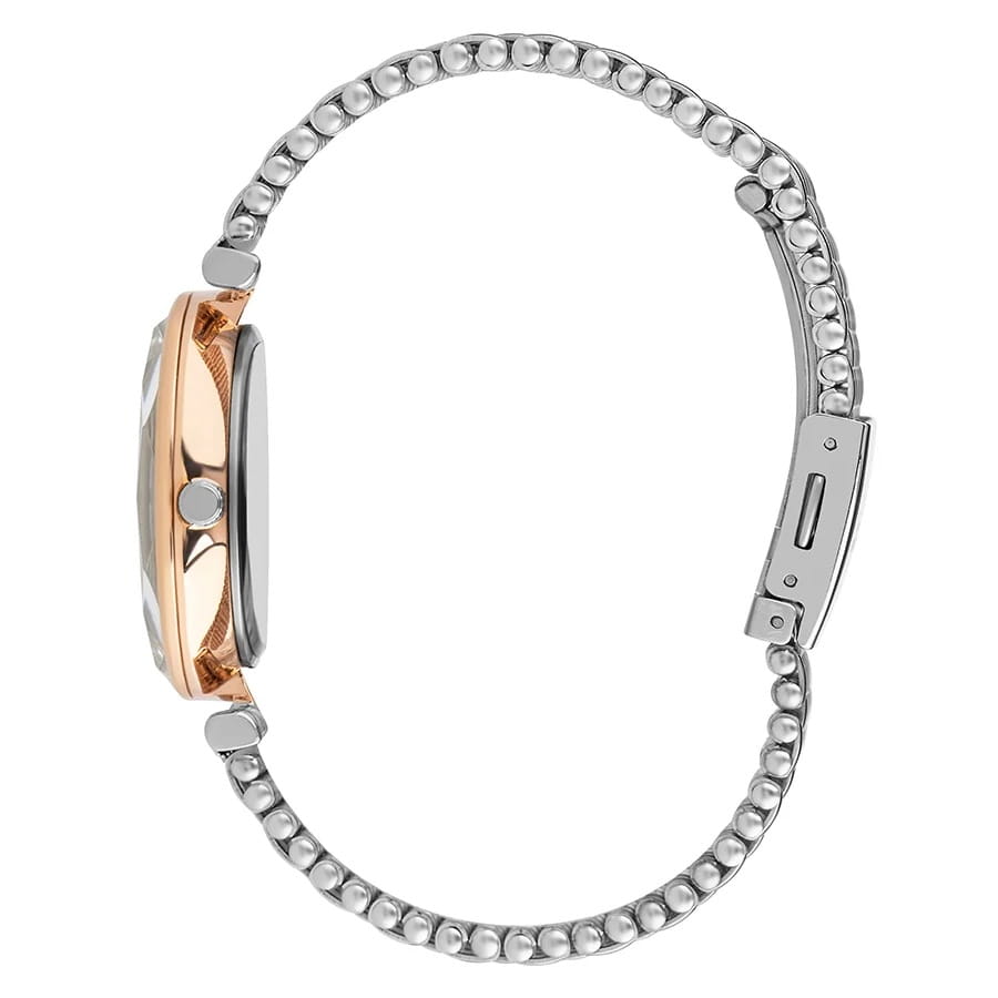 Женские наручные часы Lee Cooper LC07410.520 — это элегантная модель с утончённым дизайном. Корпус диаметром 33 мм выполнен из нержавеющей стали с IP-покрытиемIP-покрытиеМетод ионного напыления. Демонстрирует повышенную устойчивость к истиранию, окислению и химическим веществам. Под воздействием высокого давления и температуры около 1500°C молекулы металла надёжно соединяются с частицами корпуса часов., что придаёт часам изысканный вид. Перламутровый циферблат украшен изящными метками из кристаллов и стрелками, обеспечивая удобное считывание времени. Циферблат защищён минеральным стекломМинеральное стеклоМинеральное стекло представляет собой искусственно выращенный минерал кварца. Такое стекло отличается особой устойчивостью к повреждениям и царапинам. Уступает по некоторым качествам сапфировому стеклу., устойчивым к царапинам. Часы работают на кварцевом механизме, обеспечивая точность хода. Браслет из нержавеющей стали с раскладной застёжкойРаскладная застёжкаТакой тип застёжки используется только на браслетах из металла. Она никогда не раскрывается полностью, происходит разделение на 2 и более частей. Раскладывающая застёжка снизит вероятность потери часов к минимуму. гарантирует комфортное ношение и надёжную фиксацию на запястье. Водозащита 30 метров защищает часы от случайных брызг и дождя, делая их подходящими для повседневного использования.