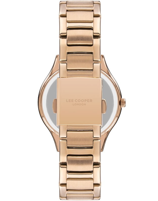 Женские наручные часы Lee Cooper LC07480.420 — это элегантная модель с утончённым дизайном. Корпус диаметром 35 мм выполнен из нержавеющей стали, а безельБезельВнешний ободок, закрепляющий стекло. В спортивных часах так называется поворотное кольцо с делениями на циферблате, выполняет роль таймера – замеряет отрезки времени на шкале. Неподвижный безель – элемент декора. Однонаправленно вращающийся безель на дайверских часах позволяет фиксировать моменты погружения и выныривания на поверхность. золотистого цвета с IP-покрытиемIP-покрытиеМетод ионного напыления. Демонстрирует повышенную устойчивость к истиранию, окислению и химическим веществам. Под воздействием высокого давления и температуры около 1500°C молекулы металла надёжно соединяются с частицами корпуса часов. и кристаллами придаёт часам изысканный вид. Перламутровый циферблат украшен изящными метками и стрелками, обеспечивая удобное считывание времени. Циферблат защищён минеральным стекломМинеральное стеклоМинеральное стекло представляет собой искусственно выращенный минерал кварца. Такое стекло отличается особой устойчивостью к повреждениям и царапинам. Уступает по некоторым качествам сапфировому стеклу., устойчивым к царапинам. Часы работают на кварцевом механизме, обеспечивая точность хода. Браслет из нержавеющей стали с раскладной застёжкойРаскладная застёжкаТакой тип застёжки используется только на браслетах из металла. Она никогда не раскрывается полностью, происходит разделение на 2 и более частей. Раскладывающая застёжка снизит вероятность потери часов к минимуму. гарантирует комфортное ношение и надёжную фиксацию на запястье. Водозащита 30 метров защищает часы от случайных брызг и дождя, делая их подходящими для повседневного использования.