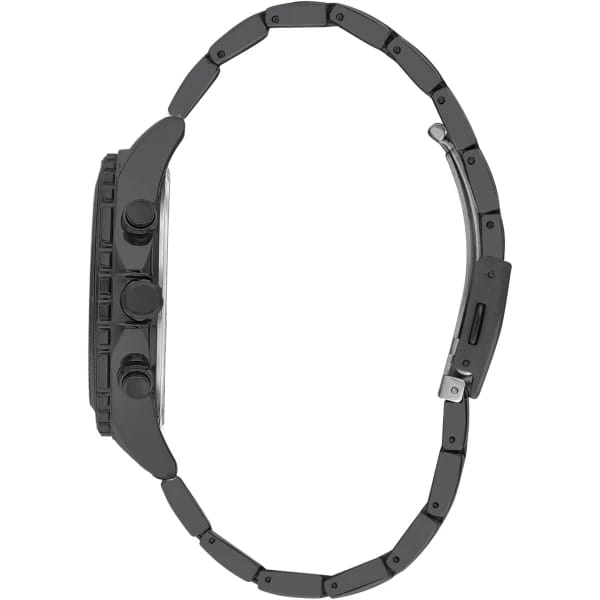 Чёрный циферблат оснащён дополнительными индикаторами и функцией хронографХронографФункция позволяет измерять отрезки времени с особой точностью: часы, минуты, секунды. Верным признаком хронографа является наличие на циферблате 3 дополнительных окошек-счётчиков., что позволяет измерять временные интервалы с высокой точностью. Стрелки и метки покрыты люминесцентным покрытиемЛюминесцентное покрытиеПозволяет считывать показания времени в темноте. Производители наносят на стрелки, часовые индексы, безель или поверхность циферблата светонакопительный состав, дающий холодное свечение., обеспечивая удобное считывание показаний в условиях недостаточного освещения. Циферблат защищён минеральным стекломМинеральное стеклоМинеральное стекло представляет собой искусственно выращенный минерал кварца. Такое стекло отличается особой устойчивостью к повреждениям и царапинам. Уступает по некоторым качествам сапфировому стеклу., устойчивым к царапинам.