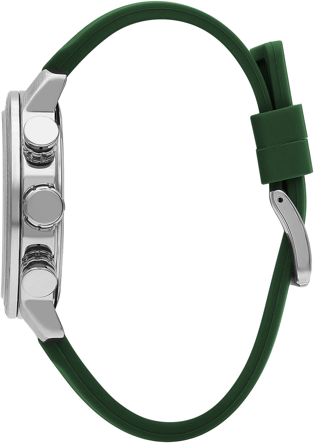 Lee Cooper LC07631.377 — элегантная модель с функциональными возможностями для повседневного использования. Корпус из суперметалла диаметром 49 мм придаёт часам классический и современный вид. Циферблат защищён минеральным стекломМинеральное стеклоМинеральное стекло представляет собой искусственно выращенный минерал кварца. Такое стекло отличается особой устойчивостью к повреждениям и царапинам. Уступает по некоторым качествам сапфировому стеклу., устойчивым к царапинам, хорошо может выдержать небольшие удары и падения. Стильный циферблат оформлен изысканными индексами и дополнен окошками даты, дня недели и 24-часового индикатора, а также аккуратными метками и стрелками с люминесцентным покрытиемЛюминесцентное покрытиеПозволяет считывать показания времени в темноте. Производители наносят на стрелки, часовые индексы, безель или поверхность циферблата светонакопительный состав, дающий холодное свечение., что гарантирует читаемость даже в условиях недостаточного освещения. Функция второго часового поясаВторой часовой поясФункция, позволяющая отображать время двух часовых поясов одновременно. делает часы удобными для путешественников. Часы работают на кварцевом механизме, обеспечивающем точность хода. Каучуковый ремешок на стандартной застёжке гарантирует удобную посадку и надёжную фиксацию на запястье. Водозащита 50 метров защищает часы от брызг и дождя, делая их подходящими для повседневного использования.