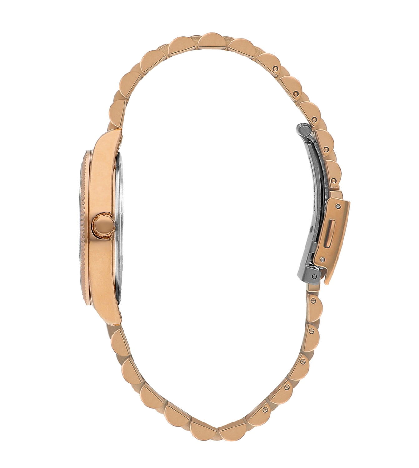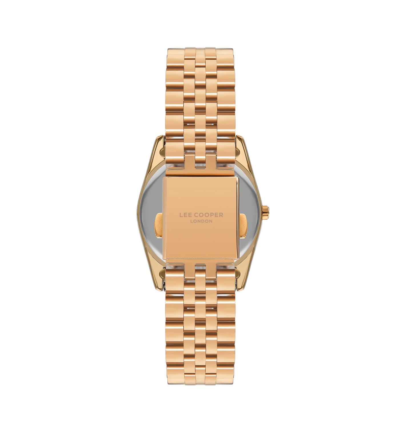 Женские часы Lee Cooper LC07811.430 — это стильное сочетание элегантности и современного дизайна. Корпус диаметром 37 мм выполнен из суперметалла с IP-покрытиемIP-покрытиеМетод ионного напыления. Демонстрирует повышенную устойчивость к истиранию, окислению и химическим веществам. Под воздействием высокого давления и температуры около 1500°C молекулы металла надёжно соединяются с частицами корпуса часов. цвета розового золота, придающий модели особый блеск. Изысканный серебристый циферблат защищен минеральным стекломМинеральное стеклоМинеральное стекло представляет собой искусственно выращенный минерал кварца. Такое стекло отличается особой устойчивостью к повреждениям и царапинам. Уступает по некоторым качествам сапфировому стеклу., обеспечивающим устойчивость к царапинам. Метки в виде римских цифр. Вынесенный циферблат с 24-х часовым указателем времени, индикацией даты и дня недели. Часы оснащены надежным кварцевым механизмом, а стальной браслет с IP-покрытиемIP-покрытиеМетод ионного напыления. Демонстрирует повышенную устойчивость к истиранию, окислению и химическим веществам. Под воздействием высокого давления и температуры около 1500°C молекулы металла надёжно соединяются с частицами корпуса часов. на раскладной застёжкеРаскладная застёжкаТакой тип застёжки используется только на браслетах из металла. Она никогда не раскрывается полностью, происходит разделение на 2 и более частей. Раскладывающая застёжка снизит вероятность потери часов к минимуму. гарантирует комфортную посадку на запястье. Водозащита 50 метров защищает модель от случайных брызг и дождя. Lee Cooper  — отличный выбор для тех, кто ценит утонченность и качество.
