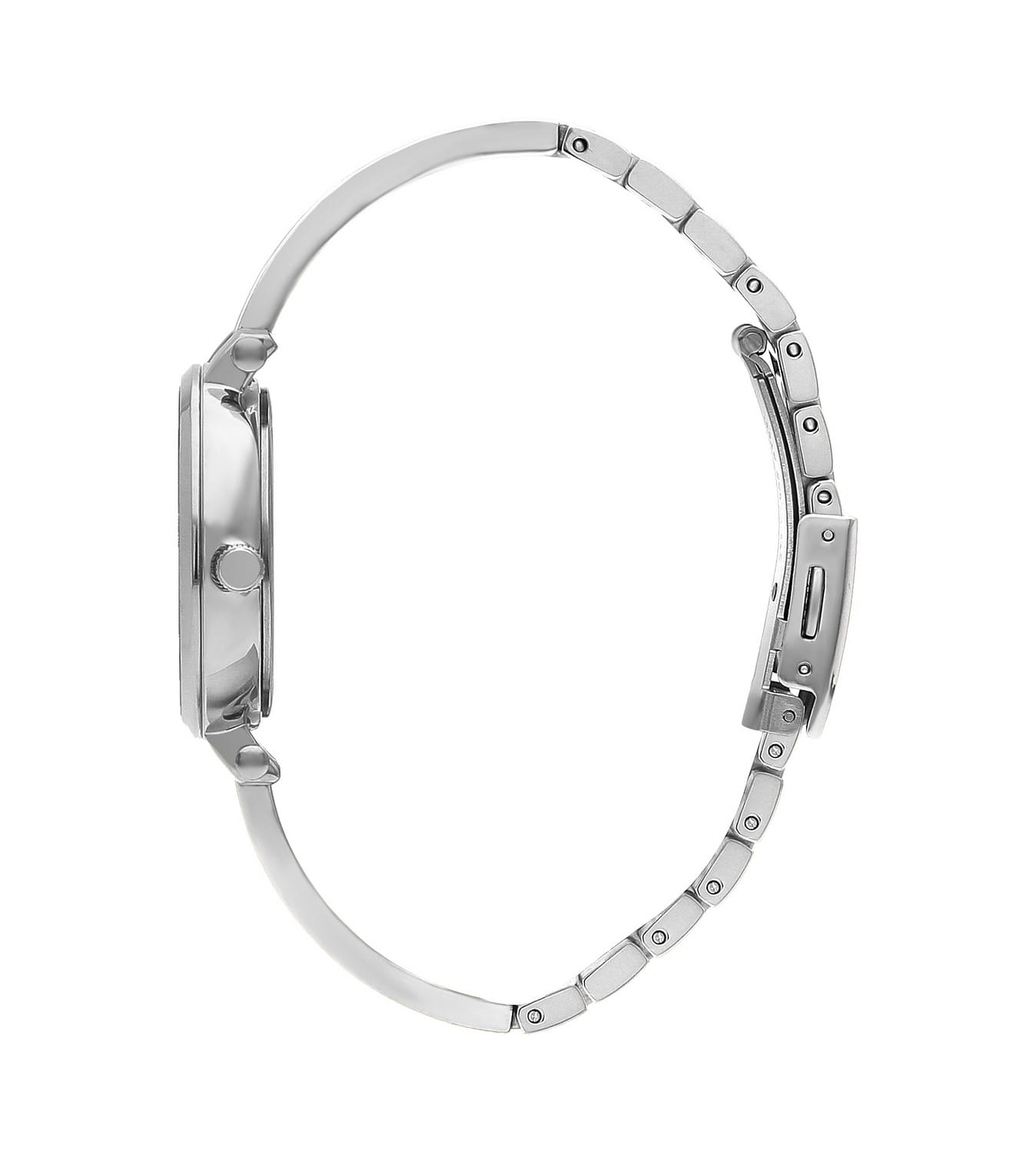 Женские часы Lee Cooper LC07813.390 выполнены в классическом стиле и сочетают строгий дизайн с надёжным механизмом. Модель оснащена кварцевым механизмом, обеспечивающим точность хода и минимальное обслуживание. Корпус круглой формы имеет размер 32 мм, изготовлен из суперметалла, гарантирует комфорт при ношении. Циферблат голубого цвета дополнен индексами для чёткого отсчёта времени. Защиту циферблата обеспечивает минеральное стеклоМинеральное стеклоМинеральное стекло представляет собой искусственно выращенный минерал кварца. Такое стекло отличается особой устойчивостью к повреждениям и царапинам. Уступает по некоторым качествам сапфировому стеклу., устойчивое к мелким механическим повреждениям. Изысканный стальной браслет с керамическими вставками на раскладной застёжкеРаскладная застёжкаТакой тип застёжки используется только на браслетах из металла. Она никогда не раскрывается полностью, происходит разделение на 2 и более частей. Раскладывающая застёжка снизит вероятность потери часов к минимуму. гарантирует комфортную посадку на запястье. Водозащита 3 АТМ позволяет использовать часы в повседневных условиях без риска повреждения от случайных брызг воды. В комплекте к часам идет дополнительный браслет в цвет часов. Это сочетание классического дизайна, прочности материалов и качества исполнения для уверенных в себе женщин.
