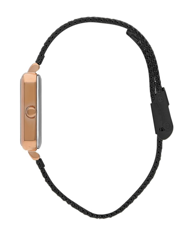 Циферблат черного цвета украшен индексами и стрелками с IP-покрытием розового золота, гармонично дополняя классический дизайн модели. Форма корпуса прямоугольная с размерами 20,5 x 26 мм, что делает часы компактными и удобными для повседневной носки.