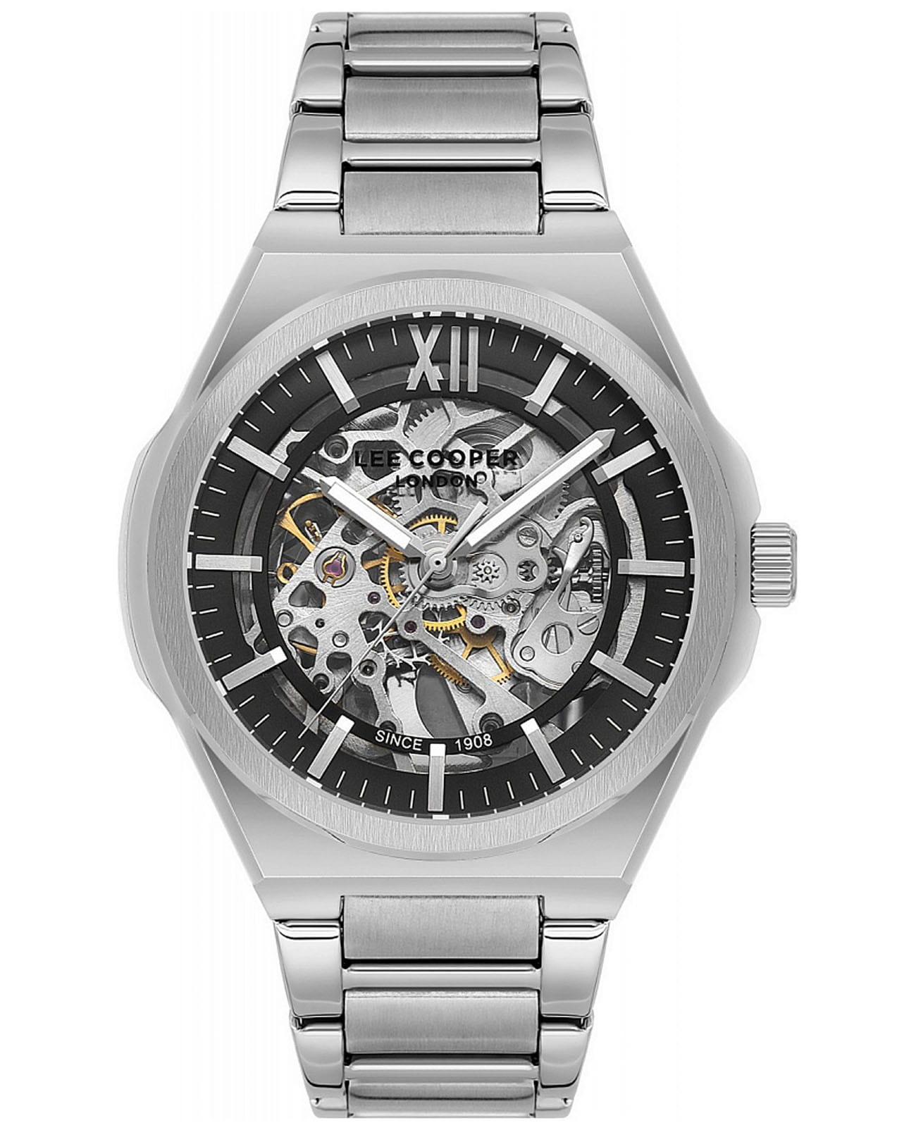 Мужские наручные часы Lee Cooper LC08051.350 — это стильная модель, сочетающая в себе современный дизайн и функциональность. Корпус часов выполнен из металла серебристого цвета с IP-покрытиемIP-покрытиеМетод ионного напыления. Демонстрирует повышенную устойчивость к истиранию, окислению и химическим веществам. Под воздействием высокого давления и температуры около 1500°C молекулы металла надёжно соединяются с частицами корпуса часов., что делает их устойчивыми к внешним воздействиям и придает благородный вид. Часы оснащены автоподзаводом калибра G3265ZH, который заряжается от движения руки и обеспечивает высокую точность хода. Чёрный циферблат украшен скелетонизированным дизайном, позволяющим наблюдать за работой механизма, что делает часы не только функциональными, но и визуально привлекательными. Для защиты циферблата используется минеральное стеклоМинеральное стеклоМинеральное стекло представляет собой искусственно выращенный минерал кварца. Такое стекло отличается особой устойчивостью к повреждениям и царапинам. Уступает по некоторым качествам сапфировому стеклу., устойчивое к царапинам и механическим повреждениям. Корпус имеет круглую форму диаметром 43 мм, что делает часы заметными и подходящими для повседневного ношения. Браслет на раскладной застёжкеРаскладная застёжкаТакой тип застёжки используется только на браслетах из металла. Она никогда не раскрывается полностью, происходит разделение на 2 и более частей. Раскладывающая застёжка снизит вероятность потери часов к минимуму.. Модель обладает водонепроницаемостью до 50 метров (5 АТМ), что позволяет использовать часы в повседневной жизни, включая контакт с водой при мытье рук или дожде. Эти часы станут идеальным выбором для мужчин, ценящих стиль, качество и функциональность.