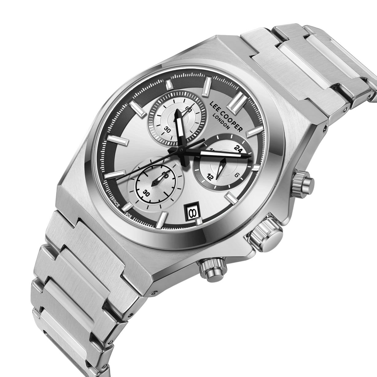 Мужские наручные часы-хронографХронографФункция позволяет измерять отрезки времени с особой точностью: часы, минуты, секунды. Верным признаком хронографа является наличие на циферблате 3 дополнительных окошек-счётчиков. Lee Cooper LC08188.330 оснащены кварцевым механизмом, обеспечивающий высокую точность хода и надежность. Элегантный корпус часов выполнен из суперметалла серебристого цвета, что делает их устойчивыми к внешним воздействиям и придает благородный вид. Циферблат украшен классическими стрелками и метками с люминесцентным покрытиемЛюминесцентное покрытиеПозволяет считывать показания времени в темноте. Производители наносят на стрелки, часовые индексы, безель или поверхность циферблата светонакопительный состав, дающий холодное свечение., гармонично дополняющим общий дизайн модели. Для защиты циферблата используется минеральное стеклоМинеральное стеклоМинеральное стекло представляет собой искусственно выращенный минерал кварца. Такое стекло отличается особой устойчивостью к повреждениям и царапинам. Уступает по некоторым качествам сапфировому стеклу., устойчивое к царапинам и механическим повреждениям. Корпус имеет круглую форму диаметром 41 мм, что делает часы заметными и подходящими. Браслет из стали оснащен раскладной застёжкойРаскладная застёжкаТакой тип застёжки используется только на браслетах из металла. Она никогда не раскрывается полностью, происходит разделение на 2 и более частей. Раскладывающая застёжка снизит вероятность потери часов к минимуму., обеспечивающим комфортное и безопасное ношение. Вынесенный циферблат с 24-х часовым указателем времени, индикацией даты и дня недели. Окошко даты находится в положении между 4 и 5 часов. Часы обладают водонепроницаемостью до 30 метров (3 АТМ), что позволяет использовать их в повседневной жизни, включая контакт с водой при мытье рук или дожде. Эти часы станут идеальным выбором для мужчин, ценящих стиль, качество и функциональность.