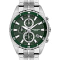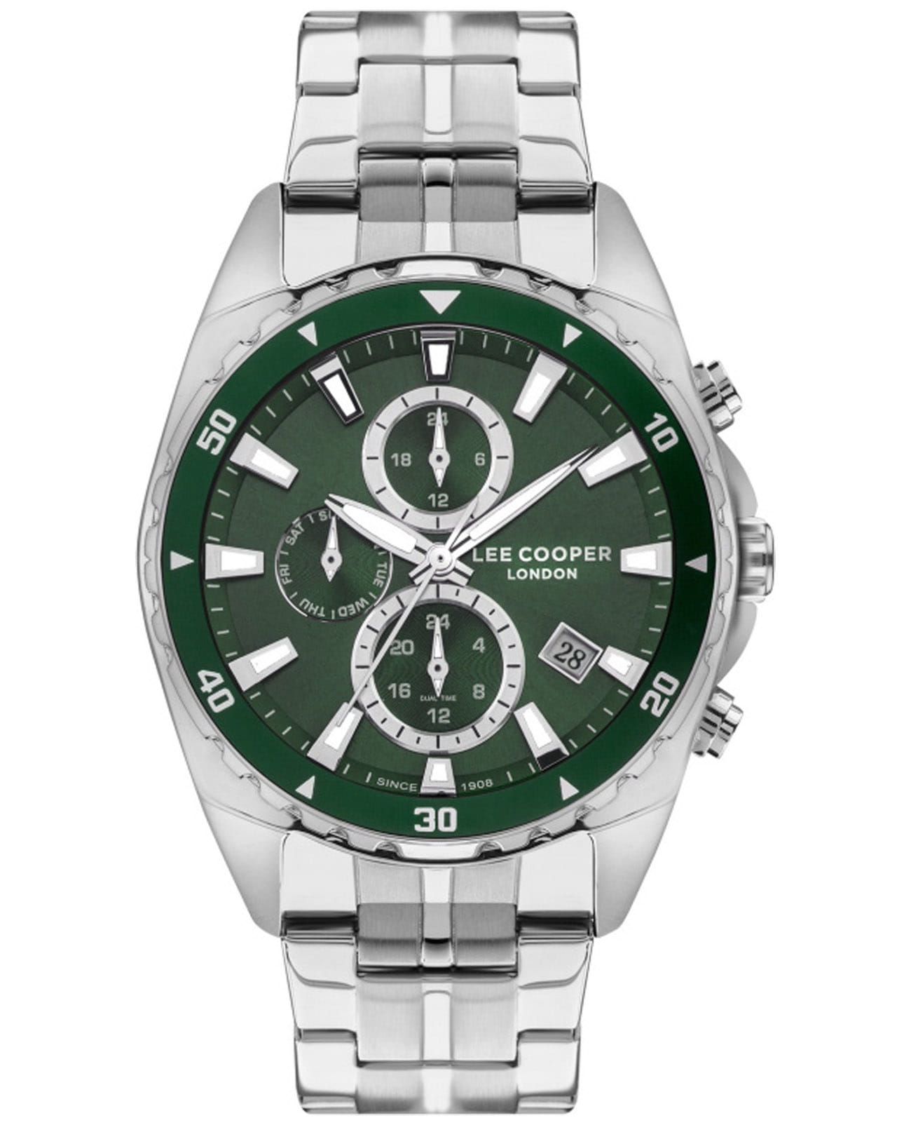 Мужские наручные часы Lee Cooper LC07515.370 — элегантная модель с функциональными возможностями для повседневного использования. Круглый корпус из суперметалла придаёт часам классический и современный вид. Зеленый циферблат оснащён дополнительными индикаторами и функцией хронографХронографФункция позволяет измерять отрезки времени с особой точностью: часы, минуты, секунды. Верным признаком хронографа является наличие на циферблате 3 дополнительных окошек-счётчиков., что позволяет измерять временные интервалы с высокой точностью. Стрелки и метки покрыты люминесцентным покрытиемЛюминесцентное покрытиеПозволяет считывать показания времени в темноте. Производители наносят на стрелки, часовые индексы, безель или поверхность циферблата светонакопительный состав, дающий холодное свечение., обеспечивая удобное считывание показаний в условиях недостаточного освещения. Циферблат защищён минеральным стекломМинеральное стеклоМинеральное стекло представляет собой искусственно выращенный минерал кварца. Такое стекло отличается особой устойчивостью к повреждениям и царапинам. Уступает по некоторым качествам сапфировому стеклу., устойчивым к царапинам. Часы работают на кварцевом механизме, обеспечивающем точность хода. Браслет из нержавеющей стали с раскладной застёжкойРаскладная застёжкаТакой тип застёжки используется только на браслетах из металла. Она никогда не раскрывается полностью, происходит разделение на 2 и более частей. Раскладывающая застёжка снизит вероятность потери часов к минимуму. гарантирует удобную посадку и надёжную фиксацию на запястье. Водозащита 50 метров защищает часы от брызг и дождя, делая их подходящими для повседневного использования.