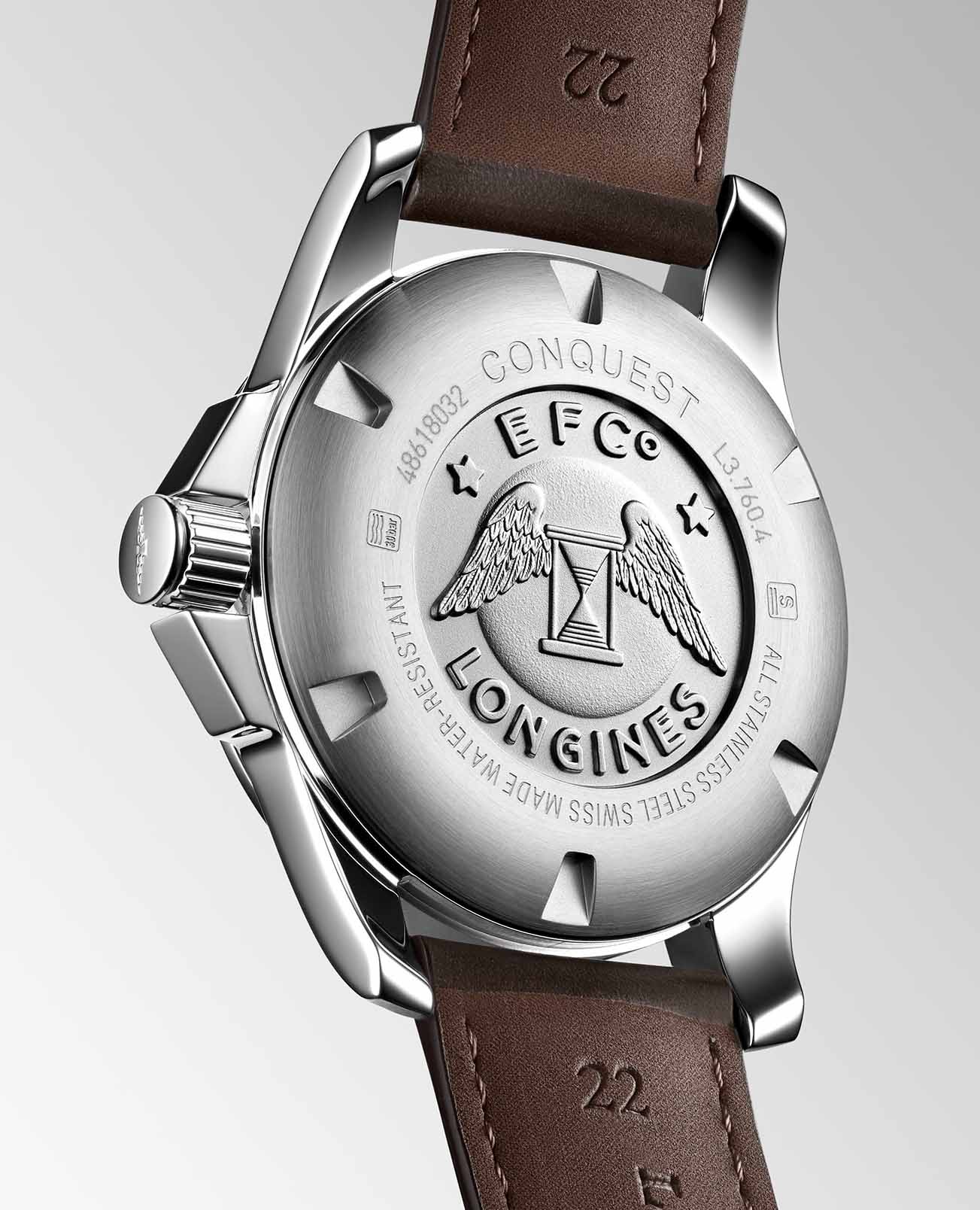 Часы Longines Conquest (артикул L37604765) сочетают спортивную элегантность и высокую функциональность, характерные для коллекции Conquest. Корпус диаметром 43 мм выполнен из нержавеющей стали с водозащитой до 30 бар (300 метров). Завинчивающаяся заводная головка и задняя крышка подчёркивают надёжность. Серебристый циферблат с солнечным узором оснащён накладными арабскими цифрами и индексами, стрелками с люминесцентным покрытиемЛюминесцентное покрытиеПозволяет считывать показания времени в темноте. Производители наносят на стрелки, часовые индексы, безель или поверхность циферблата светонакопительный состав, дающий холодное свечение., а также окошком даты в положении «3 часа». Циферблат защищён сапфировым стекломСапфировое стеклоПрочный и надёжный материал из кристалла сапфира синтетического происхождения, характеризующийся особой твёрдостью и устойчивостью к царапинам и повреждениям. с антибликовым покрытием.