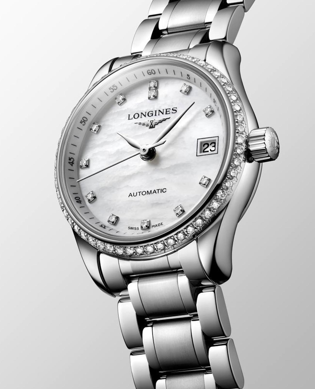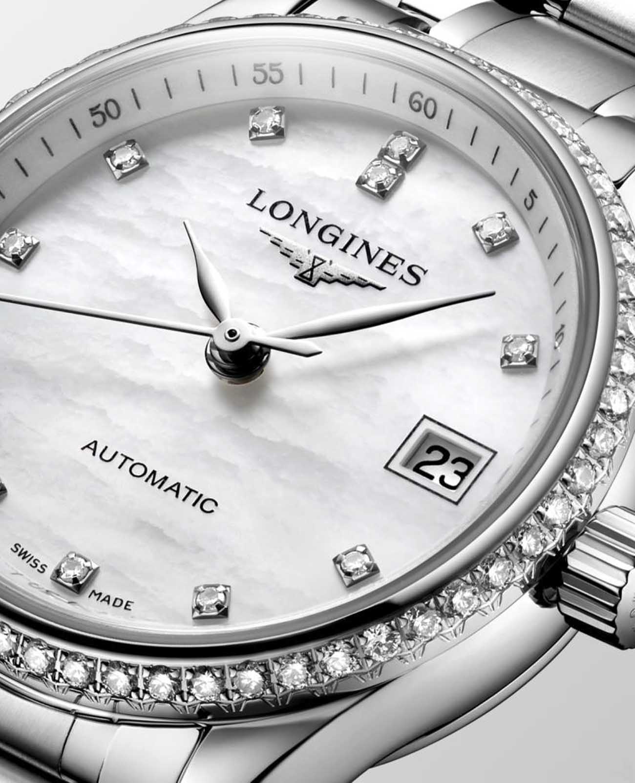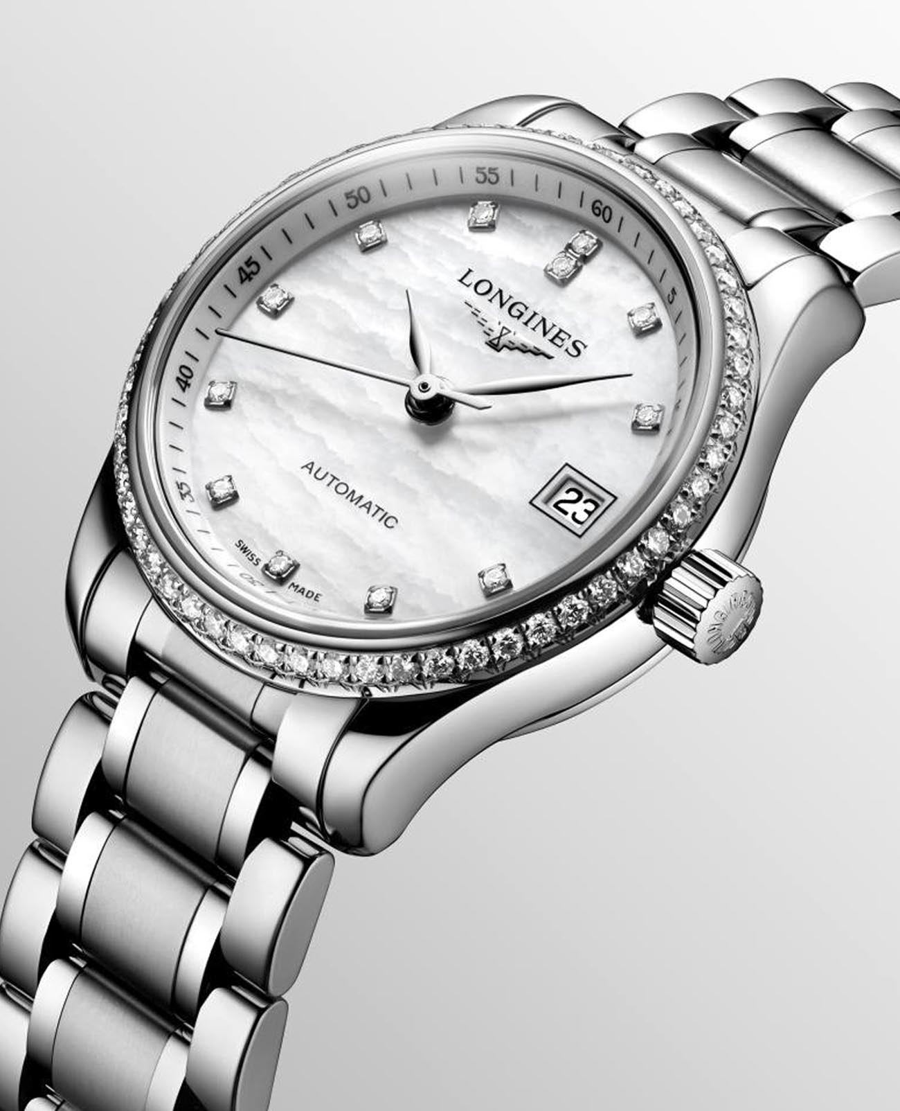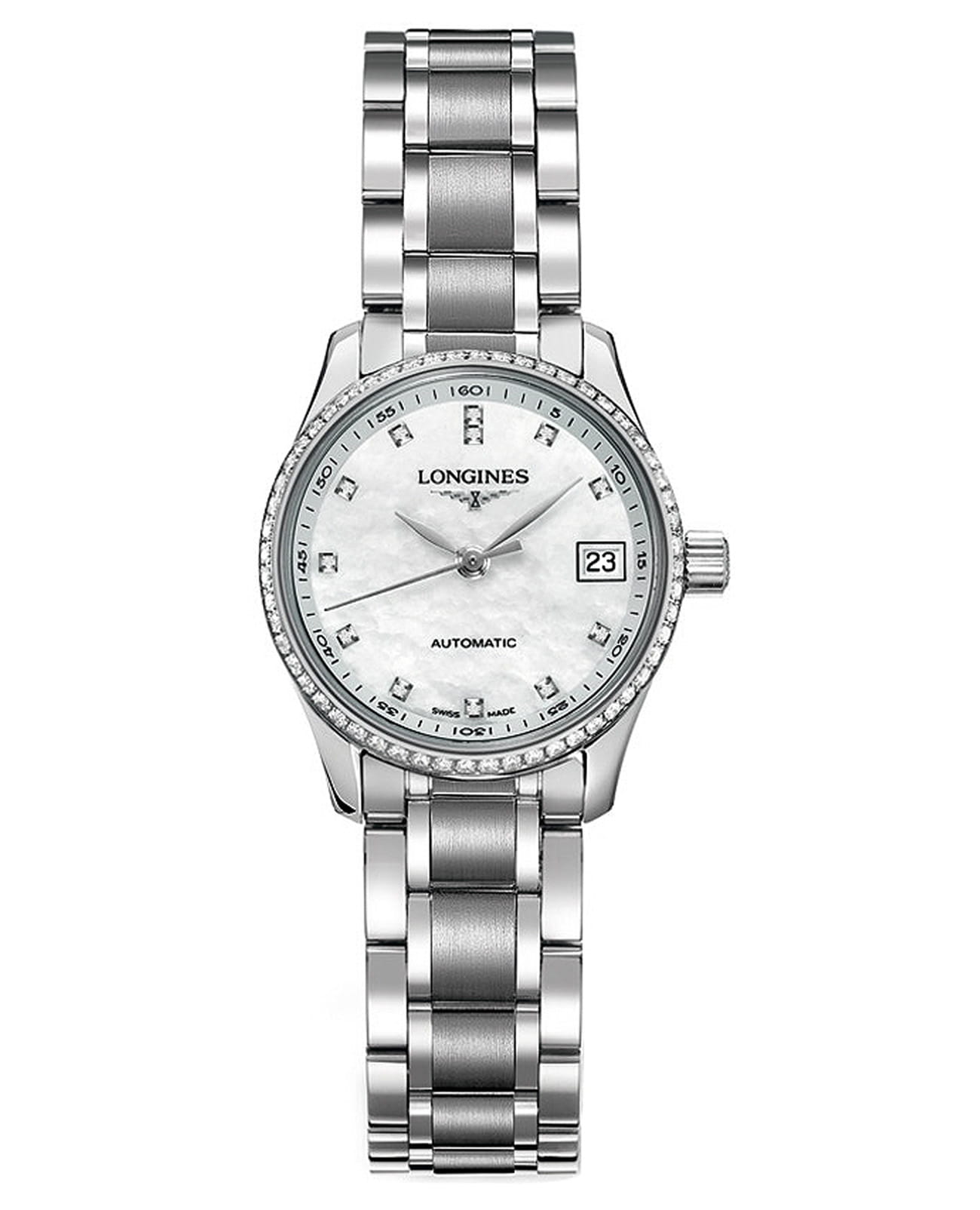 Женские швейцарские механические часы с автоподзаводом Longines Master Collection L2.128.0.87.6. Сапфировое стеклоСапфировое стеклоПрочный и надёжный материал из кристалла сапфира синтетического происхождения, характеризующийся особой твёрдостью и устойчивостью к царапинам и повреждениям. устойчивое к появлению царапин, обладающее высокой прозрачностью. Корпус часов изготовлен из нержавеющей стали. БезельБезельВнешний ободок, закрепляющий стекло. В спортивных часах так называется поворотное кольцо с делениями на циферблате, выполняет роль таймера – замеряет отрезки времени на шкале. Неподвижный безель – элемент декора. Однонаправленно вращающийся безель на дайверских часах позволяет фиксировать моменты погружения и выныривания на поверхность. украшен бриллиантами. Циферблат инкрустирован 12 бриллиантами 0,41 карата. Окошко даты в положении 3 часов. Прозрачная задняя крышка. Класс водозащиты: 30 метров, позволит защитить корпус от случайных брызг или капель дождя. Стальной браслет на застёжке «бабочка» с кнопкамиЗастёжка "бабочка"Такой вид застёжки дополняется предохранителями, помогающими избежать случайного раскрытия браслета. Обладают изящным исполнением. .