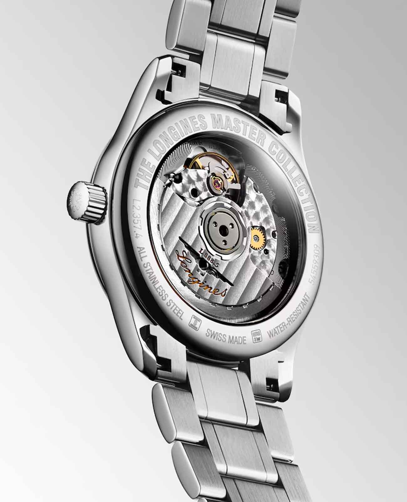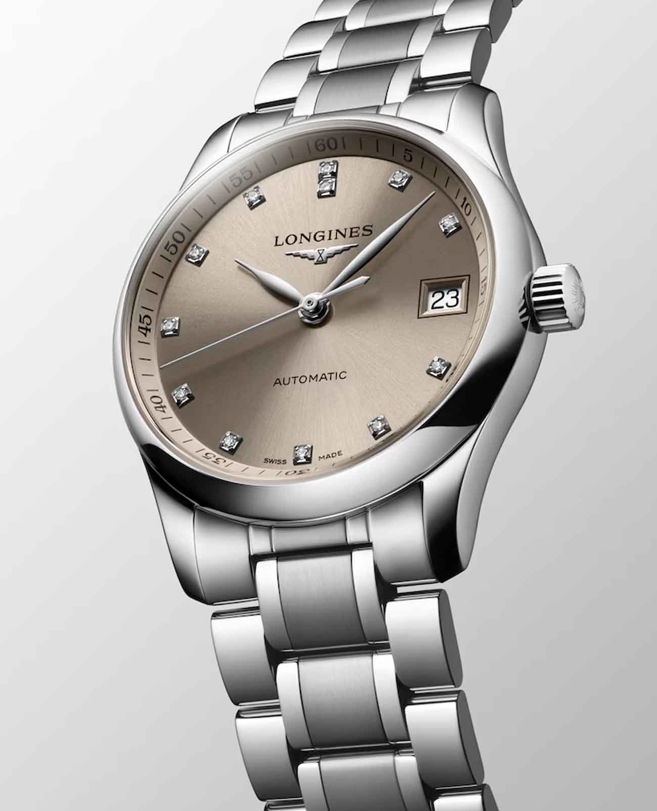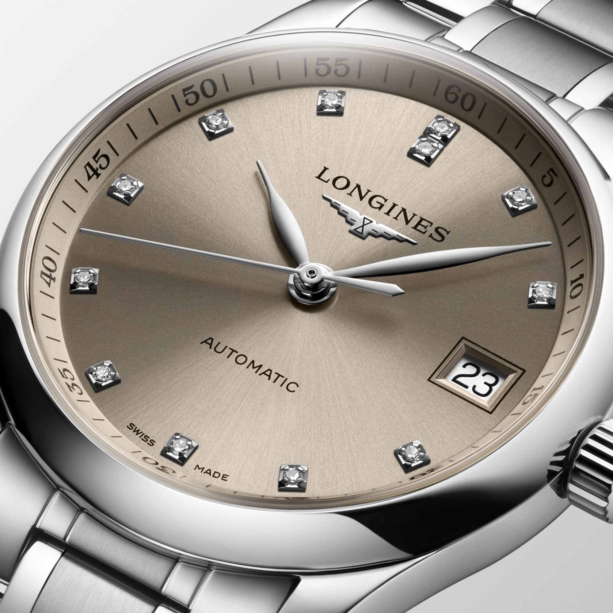 Швейцарские механические часы Longines Master Collection L2.357.4.07.6. Сапфировое стеклоСапфировое стеклоПрочный и надёжный материал из кристалла сапфира синтетического происхождения, характеризующийся особой твёрдостью и устойчивостью к царапинам и повреждениям. устойчивое к появлению царапин, обладающее высокой прозрачностью. Корпус часов изготовлен из нержавеющей стали. Циферблат с 13 бриллиантами группы Top Wesselton VS-SI общим весом 0.059 карата. Окошко даты в положении 3 часа. Автоматический механизм с частотой баланса 25 200 полуколебаний в час и запасом хода, которого хватает примерно на 72 часа работы. Класс водозащиты: 30 метров, позволит защитить корпус от случайных брызг или капель дождя. Стальной браслет на застёжке «бабочка» с кнопкамиЗастёжка "бабочка"Такой вид застёжки дополняется предохранителями, помогающими избежать случайного раскрытия браслета. Обладают изящным исполнением. .