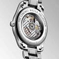 Автоматический механизм с частотой баланса 25 200 полуколебаний в час обеспечивает точность хода и длительный запас хода, который составляет примерно 72 часа. Циферблат украшен 13 бриллиантами группы Top Wesselton VS-SI общим весом 0.059 карата, придавая часам изысканный блеск. Окошко даты в положении 3 часа позволяет легко отслеживать текущую дату, а прозрачная задняя крышка открывает доступ к завораживающему виду механизма.
