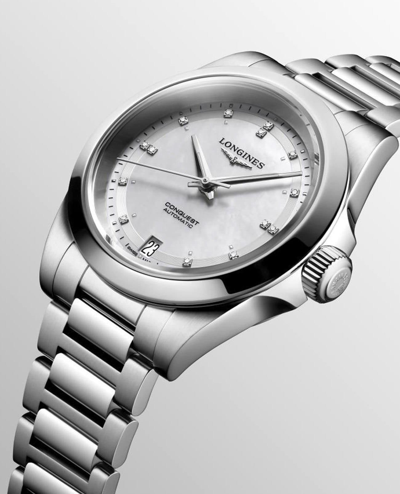 Женские швейцарские механические часы с автоподзаводом Longines Conquest L3.430.4.87.6. Сапфировое стеклоСапфировое стеклоПрочный и надёжный материал из кристалла сапфира синтетического происхождения, характеризующийся особой твёрдостью и устойчивостью к царапинам и повреждениям. устойчивое к появлению царапин, обладающее высокой прозрачностью. Корпус часов изготовлен из нержавеющей стали. Стрелки с люминесцентным покрытиемЛюминесцентное покрытиеПозволяет считывать показания времени в темноте. Производители наносят на стрелки, часовые индексы, безель или поверхность циферблата светонакопительный состав, дающий холодное свечение.. Циферблат украшают 12 бриллиантов. Окошко даты в положении 6 часов. Класс водозащиты: 100 метров, позволит плавать, нырять и заниматься другими водными видами спорта. Стальной браслет на раскладной застёжкеРаскладная застёжкаТакой тип застёжки используется только на браслетах из металла. Она никогда не раскрывается полностью, происходит разделение на 2 и более частей. Раскладывающая застёжка снизит вероятность потери часов к минимуму..
