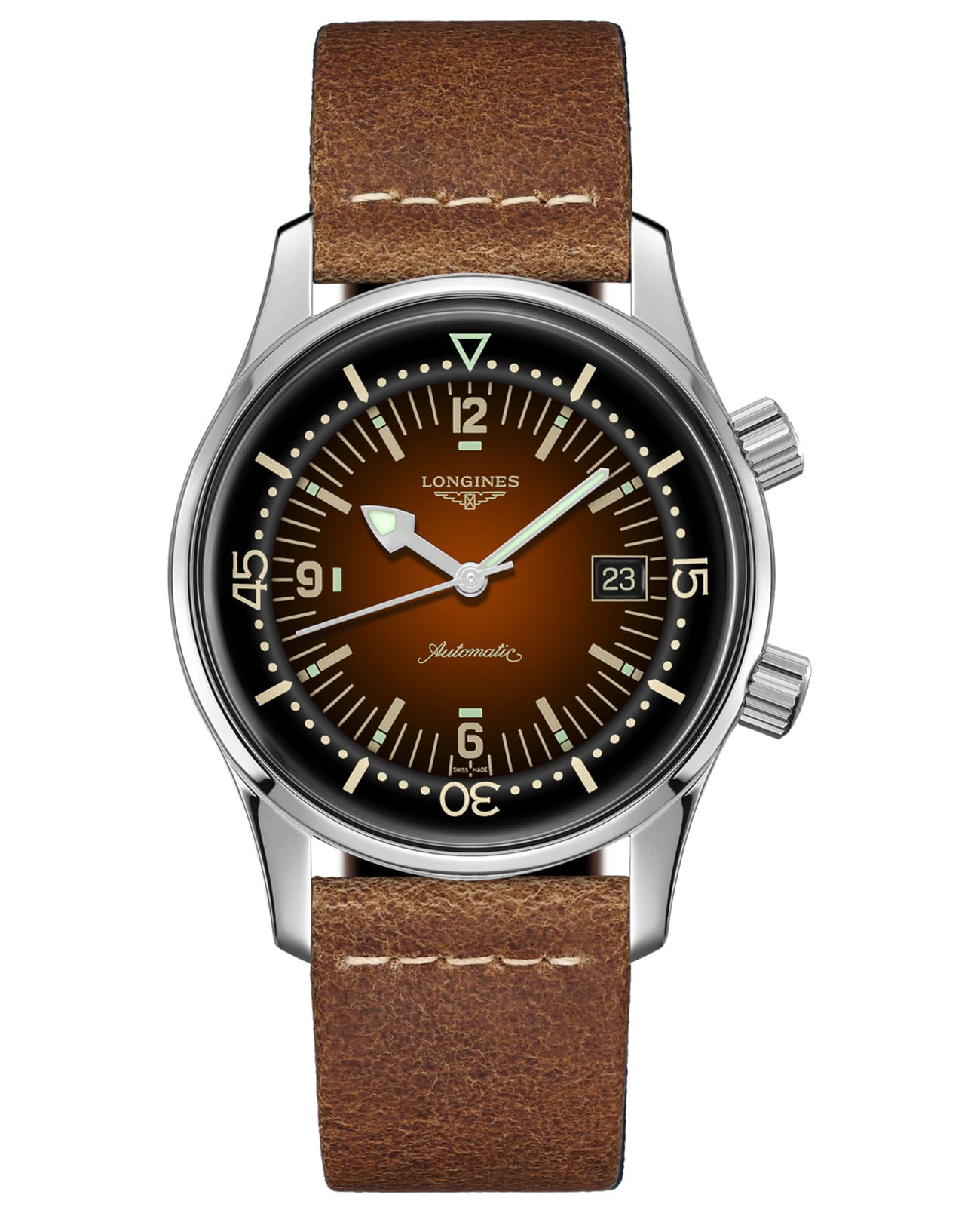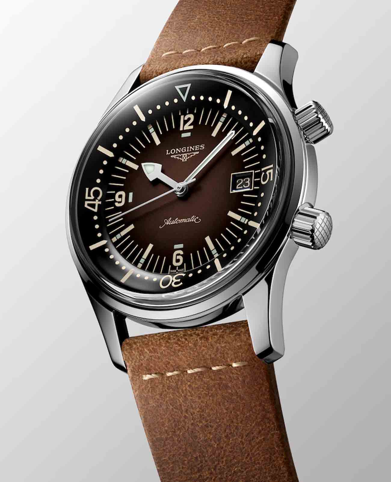 Швейцарские механические часы с автоподзаводом Longines Legend Diver Watch L3.774.4.60.2. Циферблат отличается улучшенной читабельностью показателей благодаря крупной индикации времени, стрелками и метками с люминесцентной подсветкойЛюминесцентное покрытиеПозволяет считывать показания времени в темноте. Производители наносят на стрелки, часовые индексы, безель или поверхность циферблата светонакопительный состав, дающий холодное свечение., антибликовому покрытиюАнтибликовое покрытиеСлой оксида металла в 0,13-0,3 микрон, благодаря которому стекло часов не бликует и не отражает свет. Антибликовое покрытие уменьшает отражение света в 10 раз, обеспечивая отличную читаемость показателей циферблата. сапфирового стеклаСапфировое стеклоПрочный и надёжный материал из кристалла сапфира синтетического происхождения, характеризующийся особой твёрдостью и устойчивостью к царапинам и повреждениям.. Окошко даты находится в положении 3 часа. Автоматический механизм с частотой баланса 25 200 полуколебаний в час и запасом хода, которого хватает примерно на 72 часа работы. Кожаный ремешок на стандартной застёжке.