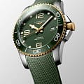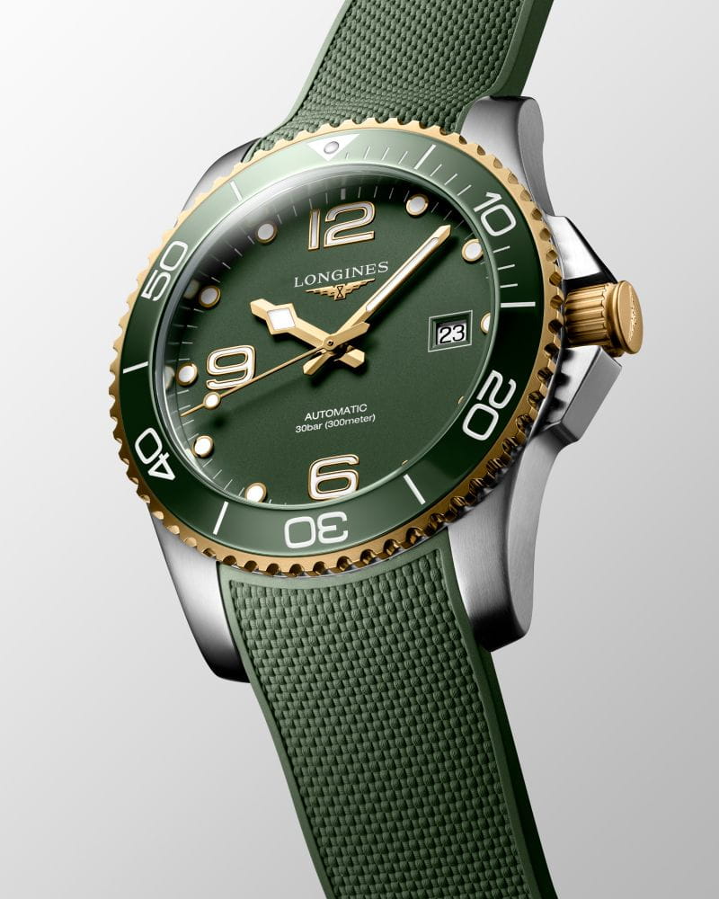 Мужские механические швейцарские часы с автоподзаводом Longines HydroConquest L3.781.3.06.9. Сапфировое стеклоСапфировое стеклоПрочный и надёжный материал из кристалла сапфира синтетического происхождения, характеризующийся особой твёрдостью и устойчивостью к царапинам и повреждениям. с антибликовым покрытием, устойчивое к мелким механическим повреждениям. Корпус часов изготовлен из нержавеющей стали. Вращающийся стальной безельБезельВнешний ободок, закрепляющий стекло. В спортивных часах так называется поворотное кольцо с делениями на циферблате, выполняет роль таймера – замеряет отрезки времени на шкале. Неподвижный безель – элемент декора. Однонаправленно вращающийся безель на дайверских часах позволяет фиксировать моменты погружения и выныривания на поверхность. с люминесцентным покрытиемЛюминесцентное покрытиеПозволяет считывать показания времени в темноте. Производители наносят на стрелки, часовые индексы, безель или поверхность циферблата светонакопительный состав, дающий холодное свечение. Superluminova из нержавеющей стали с PVD-покрытиемPVDУльтратонкое покрытие наносится в технике вакуумного напыления, сочетает в себе нитрид титана особой прочности со слоем золота или оксида хрома. Несёт в себе декоративную или защитную функцию. и керамики, защищенный от царапин, никогда не изнашивается и не выцветает. Стрелки и метки с люминесцентным покрытиемЛюминесцентное покрытиеПозволяет считывать показания времени в темноте. Производители наносят на стрелки, часовые индексы, безель или поверхность циферблата светонакопительный состав, дающий холодное свечение.. Окошко даты находится в положении 3 часа. Класс водозащиты: 300 метров, позволит плавать, нырять и заниматься другими водными видами спорта. Каучуковый ремешок на раскладной застёжкеРаскладная застёжкаТакой тип застёжки используется только на браслетах из металла. Она никогда не раскрывается полностью, происходит разделение на 2 и более частей. Раскладывающая застёжка снизит вероятность потери часов к минимуму. с удлинением для дайверов.