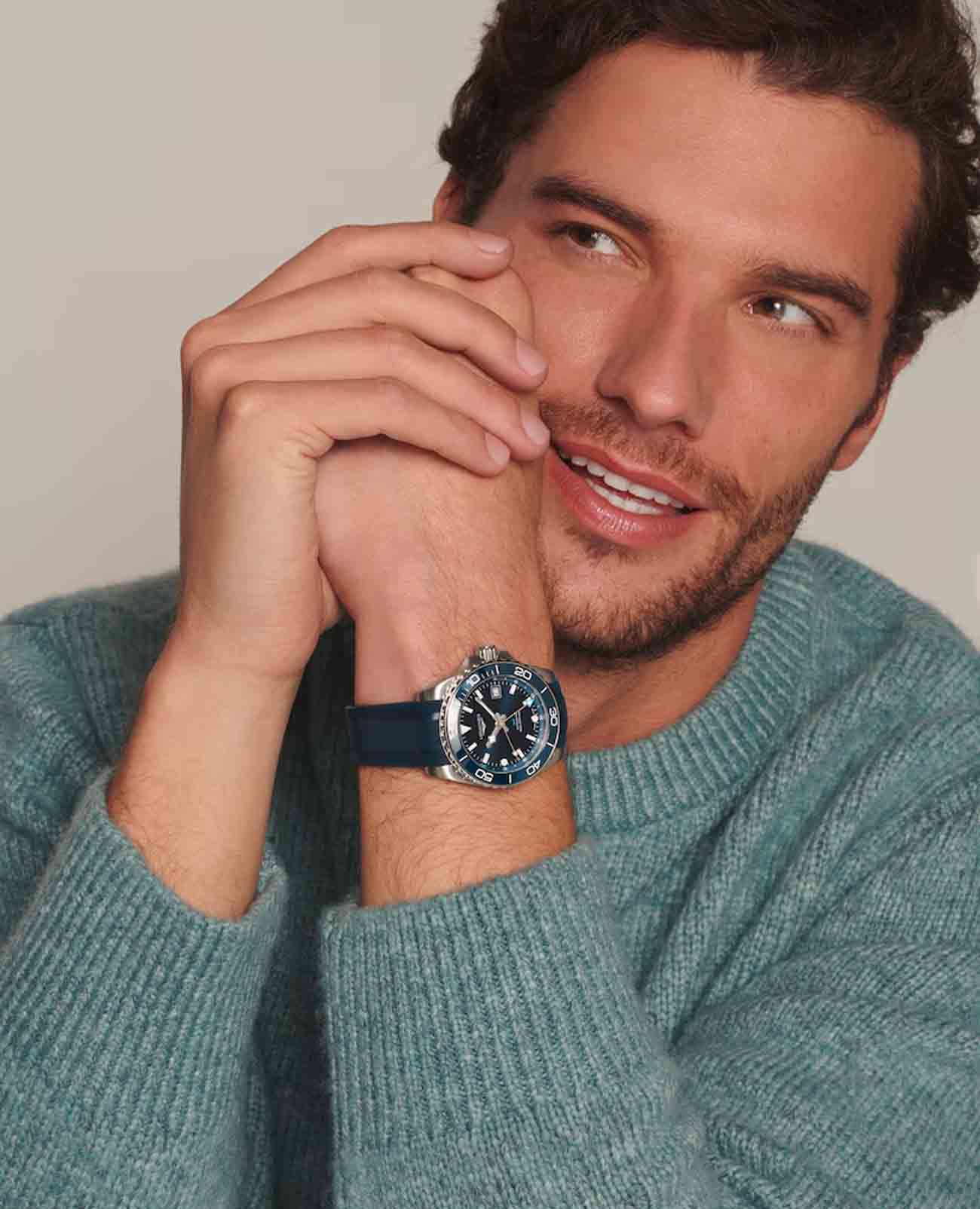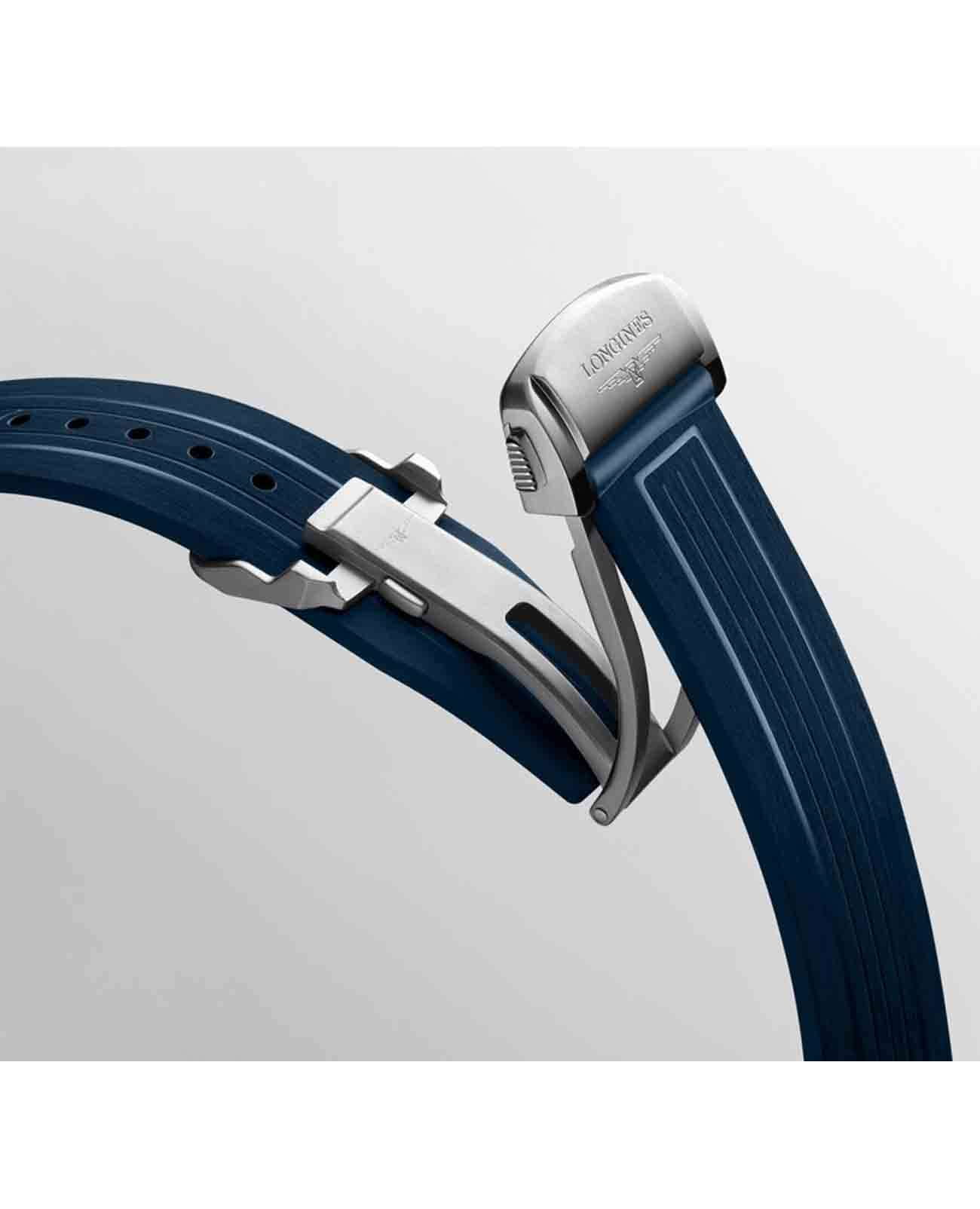 Мужские швейцарские механические часы для дайвинга Longines HydroConquest L3.790.4.96.9. Сапфировое стеклоСапфировое стеклоПрочный и надёжный материал из кристалла сапфира синтетического происхождения, характеризующийся особой твёрдостью и устойчивостью к царапинам и повреждениям. с многослойным антибликовым покрытием с обеих сторон, устойчивое к появлению царапин, обладающее высокой прозрачностью. Корпус часов изготовлен из стали. Вращающийся безельБезельВнешний ободок, закрепляющий стекло. В спортивных часах так называется поворотное кольцо с делениями на циферблате, выполняет роль таймера – замеряет отрезки времени на шкале. Неподвижный безель – элемент декора. Однонаправленно вращающийся безель на дайверских часах позволяет фиксировать моменты погружения и выныривания на поверхность. из стали и керамики, защищенный от царапин, никогда не изнашивается и не выцветает. Стрелки и метки с люминесцентным покрытиемЛюминесцентное покрытиеПозволяет считывать показания времени в темноте. Производители наносят на стрелки, часовые индексы, безель или поверхность циферблата светонакопительный состав, дающий холодное свечение.. Окошко даты находится в положении 3 часов. Класс водозащиты: 300 метров, позволит плавать, нырять и заниматься другими водными видами спорта. Каучуковый ремешок на застёжке «бабочка» с кнопкамиЗастёжка "бабочка"Такой вид застёжки дополняется предохранителями, помогающими избежать случайного раскрытия браслета. Обладают изящным исполнением. .