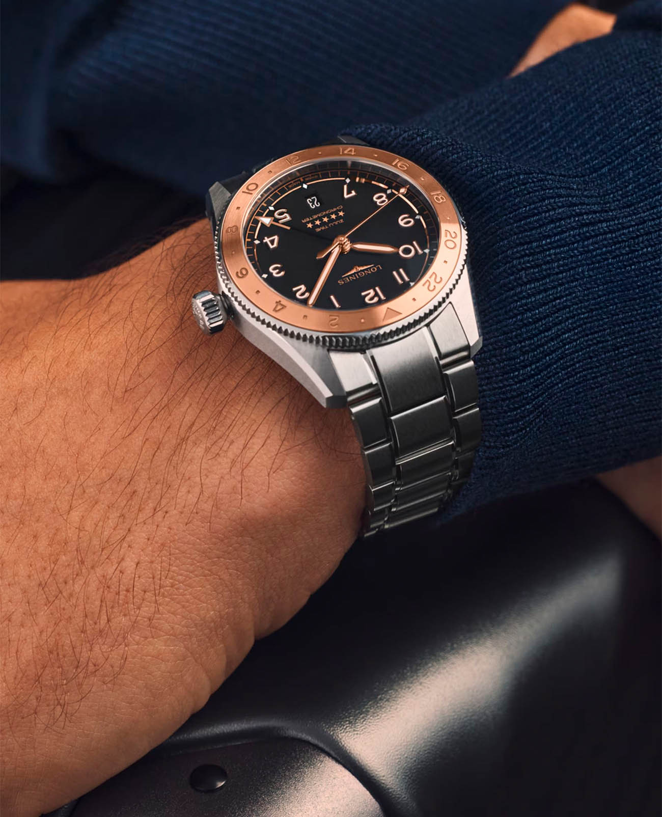 Часы Longines Spirit Zulu Time 1925 L3.803.5.53.6 выполнены в классическом круглом корпусе диаметром 39 мм из нержавеющей стали, 18-каратного розового золота и оснащены двунаправленным вращающимся безелем. Модель укомплектована автоматическим механизмом калибра L844.4, обеспечивающим запас хода до 72 часов. Механизм имеет сертификат хронометра и оснащён балансовой пружиной из монокристаллического кремния, устойчивой к магнитным полям и перепадам температур. Также реализована функция второго часового поясаВторой часовой поясФункция, позволяющая отображать время двух часовых поясов одновременно. и отображение даты. Циферблат матового чёрного цвета дополнен арабскими цифрами с покрытием Swiss Super-LumiNova®Люминесцентное покрытиеПозволяет считывать показания времени в темноте. Производители наносят на стрелки, часовые индексы, безель или поверхность циферблата светонакопительный состав, дающий холодное свечение., что обеспечивает отличную читаемость даже в темноте. Стрелки окрашены в розовый цвет для лучшей контрастности. Защиту циферблата обеспечивает сапфировое стеклоСапфировое стеклоПрочный и надёжный материал из кристалла сапфира синтетического происхождения, характеризующийся особой твёрдостью и устойчивостью к царапинам и повреждениям. с многослойным антибликовым покрытиемАнтибликовое покрытиеСлой оксида металла в 0,13-0,3 микрон, благодаря которому стекло часов не бликует и не отражает свет. Антибликовое покрытие уменьшает отражение света в 10 раз, обеспечивая отличную читаемость показателей циферблата. с обеих сторон. Задняя крышка — прозрачная, выполненная из сапфирового стекла, что позволяет наблюдать за работой механизма. Водозащита позволяет использовать часы в повседневных условиях, включая плавание. Диаметр корпуса — 39 мм, между лугами — 21 мм, толщина — 13.5 мм, общая длина от луга до луга — 46.8 мм. Вес модели — около 158 грамм. Часы установлены на стальной браслет с системой быстрой смены ремешка и оснащены надёжной раскладной застёжкой с кнопками. Это сочетание высокой технологии, точности и элегантности для ценителей премиального качества и исторического наследия.