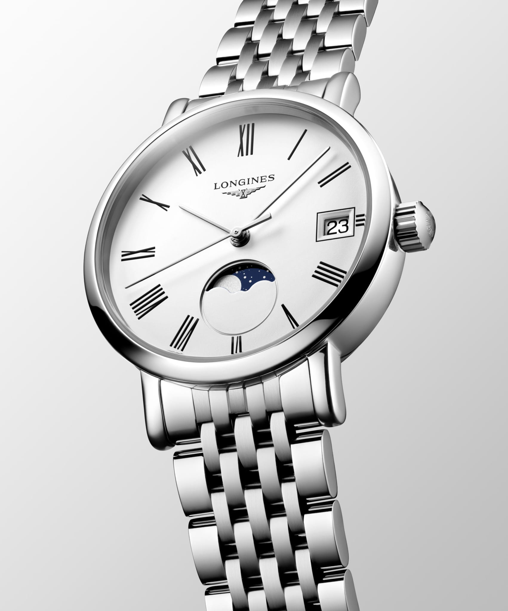 Мужские швейцарские наручные часы Longines Elegant Collection Moonphase L4.330.4.11.6 с надёжным кварцевым механизмом. Корпус часов изготовлен из нержавеющей стали. Сапфировое стеклоСапфировое стеклоПрочный и надёжный материал из кристалла сапфира синтетического происхождения, характеризующийся особой твёрдостью и устойчивостью к царапинам и повреждениям. устойчивое к мелким механическим повреждениям. Окошко даты в положении 3 часов. Лунный календарь в положении 6 часов. Класс водозащиты: 30 метров, позволит защитить корпус от случайных брызг или капель дождя. Стальной браслет на застёжке-бабочке с кнопкамиЗастёжка "бабочка"Такой вид застёжки дополняется предохранителями, помогающими избежать случайного раскрытия браслета. Обладают изящным исполнением. .