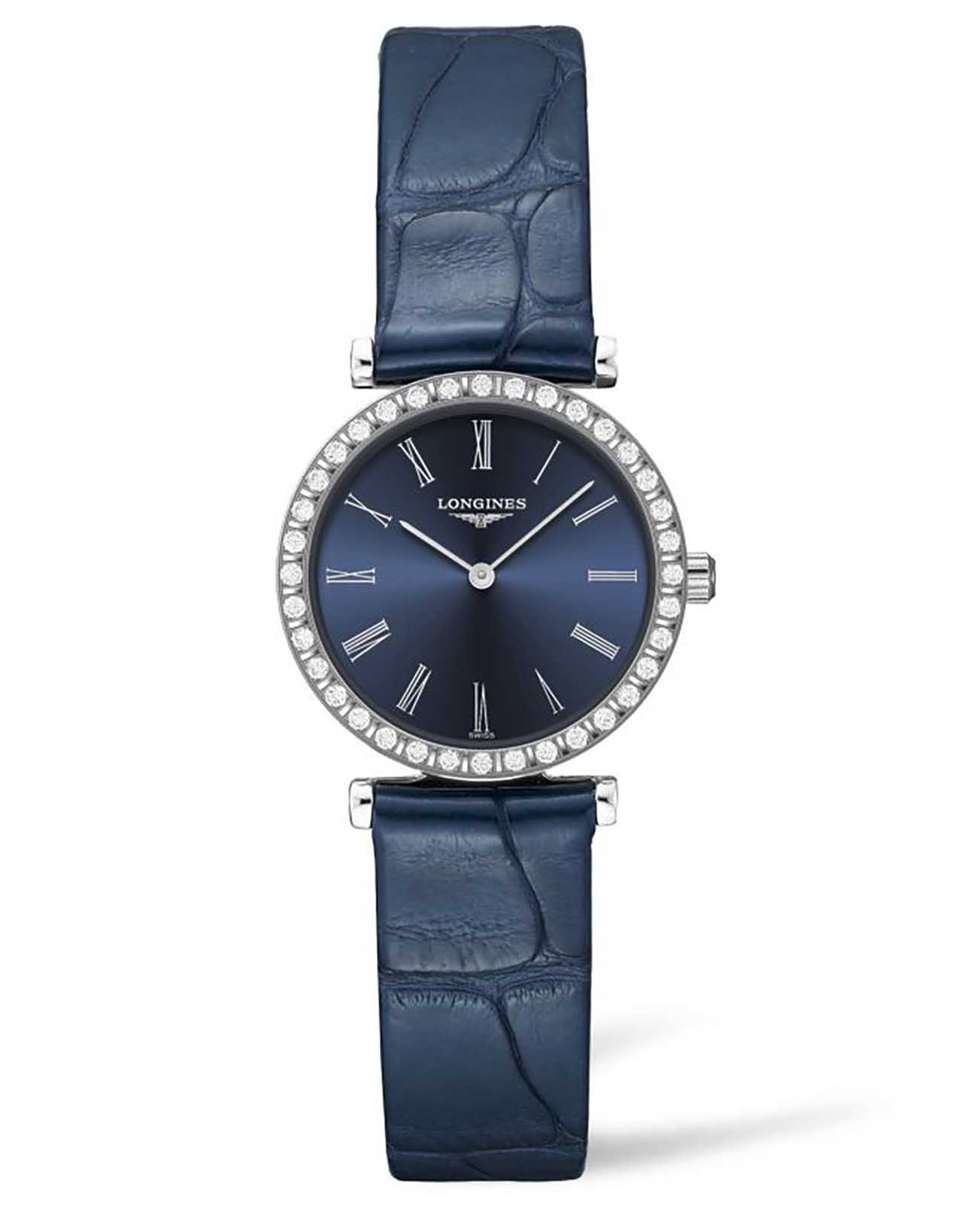 Компактный синий циферблат украшен 36 бриллиантами общим весом 0.302 карата. Элегантным дополнением стал ремешок из кожи аллигатора. Швейцарский кварцевый калибр L209 обеспечивает высокую точность хода. Сапфировое стекло не допускает появления царапин на поверхности.