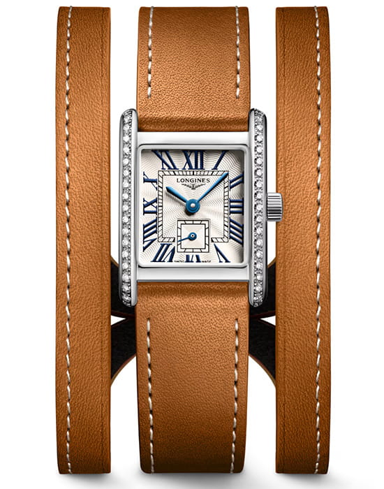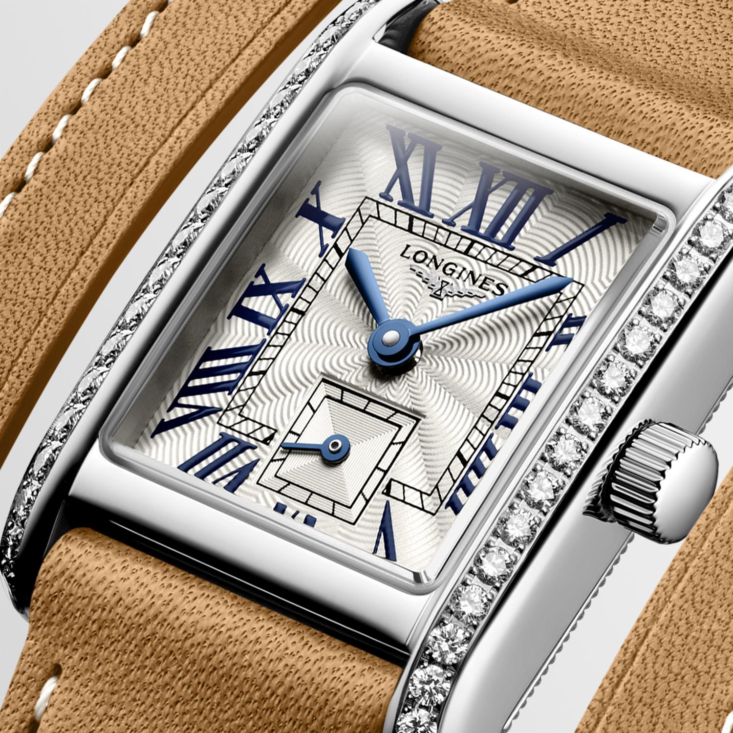 Женские швейцарские наручные часы Longines Mini Dolcevita L5.200.0.71.0 с надёжным кварцевым механизмом. Корпус часов изготовлен из нержавеющей стали. Сапфировое стеклоСапфировое стеклоПрочный и надёжный материал из кристалла сапфира синтетического происхождения, характеризующийся особой твёрдостью и устойчивостью к царапинам и повреждениям. устойчивое к мелким механическим повреждениям. Кожаный ремешок на стандартной застёжке. Класс водозащиты: 30 метров, позволит защитить корпус от случайных брызг или капель дождя. Корпус с 38 бриллиантами группы Top Wesselton IF-VVS общим весом 0.456 карата.