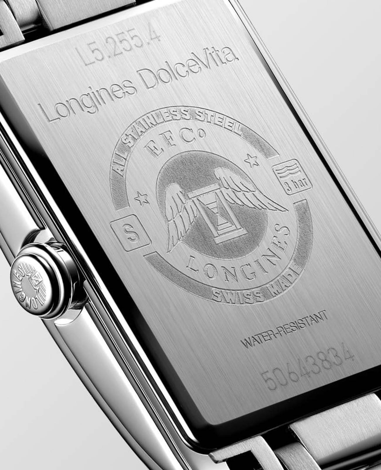 Женские швейцарские часы Longines DolceVita L52554756, кварцевый механизм с высокой точностью. Сапфировое стеклоСапфировое стеклоПрочный и надёжный материал из кристалла сапфира синтетического происхождения, характеризующийся особой твёрдостью и устойчивостью к царапинам и повреждениям. устойчивое к появлению царапин, обладающее высокой прозрачностью. Корпус часов изготовлен из нержавеющей стали. Циферблат украшен римскими цифрами. Малая секундная стрелка в положении 6 часов. Класс водозащиты: 30 метров, позволит защитить корпус от случайных брызг или капель дождя. Браслет из нержавеющей стали на застёжке «бабочка» с кнопкамиЗастёжка "бабочка"Такой вид застёжки дополняется предохранителями, помогающими избежать случайного раскрытия браслета. Обладают изящным исполнением. .