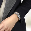 Браслет состоит из стали и 18-каратного золота18-каратное золотоОбозначение по каратной системе пробирования, оно показывает, сколько драгоценного металла содержится в изделии. 18 карат - в составе 75% чистого золота, соответствует 750 пробе.