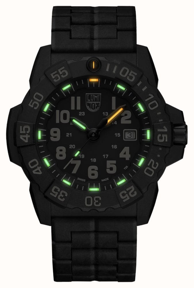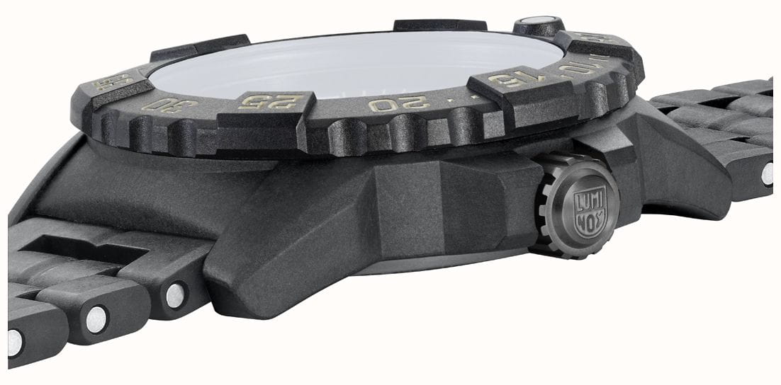 Мужские наручные часы Luminox XS.3510 из коллекции Navy SEAL сочетают в себе спортивный дизайн и надежность швейцарского качества . Модель обладает круглым корпусом диаметром 45 мм, изготовленным из карбонаКарбонОт «carbon», «carbone» - углерод, углепластик - полимерный композиционный материал из переплетённых под определенным углом между собой нитей углеродного волокна, применяется для изготовления лёгких, но прочных деталей. В часах часто используют для украшения циферблатов и ремешков. Так же карбон используется в изготовлении корпусов. Такие корпуса обладают антикоррозионным свойством, не поддаются электромагнитному излучению, обладают повышенной прочностью и противоударностью. (CARBONOX™), что обеспечивает высокую устойчивость к внешним воздействиям при сохранении легкости . Циферблат черного цвета украшен контрастными метками и стрелками с люминесцентным покрытиемЛюминесцентное покрытиеПозволяет считывать показания времени в темноте. Производители наносят на стрелки, часовые индексы, безель или поверхность циферблата светонакопительный состав, дающий холодное свечение., гарантирующим постоянную видимость времени даже в условиях низкой освещенности благодаря системе LLTLLTLLT — это автономный механизм подсветки, основанный на использовании микроскопических газонаполненных элементов. Специальные герметичные капсулы из боросиликатного стекла, интегрированные в циферблат, генерируют свечение без необходимости подключения к внешним источникам энергии. Для их работы не требуется ни дополнительный свет, ни механическое воздействие (например, нажатие кнопки). Свечение возникает благодаря химическому процессу: реакция между тритием, заключенным в капсулах, и люминофорным покрытием создает стабильное автономное освещение. Технология обеспечивает энергетическую независимость и долговечность подсветки. (микрогазовые огни) . Часы оснащены кварцевым механизмом швейцарского производства Ronda 715, обеспечивающим точность хода ±15 секунд в месяц . Защиту циферблата обеспечивает прочное минеральное стеклоМинеральное стеклоМинеральное стекло представляет собой искусственно выращенный минерал кварца. Такое стекло отличается особой устойчивостью к повреждениям и царапинам. Уступает по некоторым качествам сапфировому стеклу. с антибликовым покрытиемАнтибликовое покрытиеСлой оксида металла в 0,13-0,3 микрон, благодаря которому стекло часов не бликует и не отражает свет. Антибликовое покрытие уменьшает отражение света в 10 раз, обеспечивая отличную читаемость показателей циферблата., устойчивое к царапинам и механическим повреждениям . Водонепроницаемость модели достигает 20 атмосфер (200 метров), что делает их подходящими для плавания и активного отдыха на воде, включая дайвинг . Модель также оснащена безелемБезельВнешний ободок, закрепляющий стекло. В спортивных часах так называется поворотное кольцо с делениями на циферблате, выполняет роль таймера – замеряет отрезки времени на шкале. Неподвижный безель – элемент декора. Однонаправленно вращающийся безель на дайверских часах позволяет фиксировать моменты погружения и выныривания на поверхность. с односторонним вращением, что добавляет функциональности при использовании в водных условиях . Ремешок выполнен из черного полиуретана, что обеспечивает комфортное ношение в т