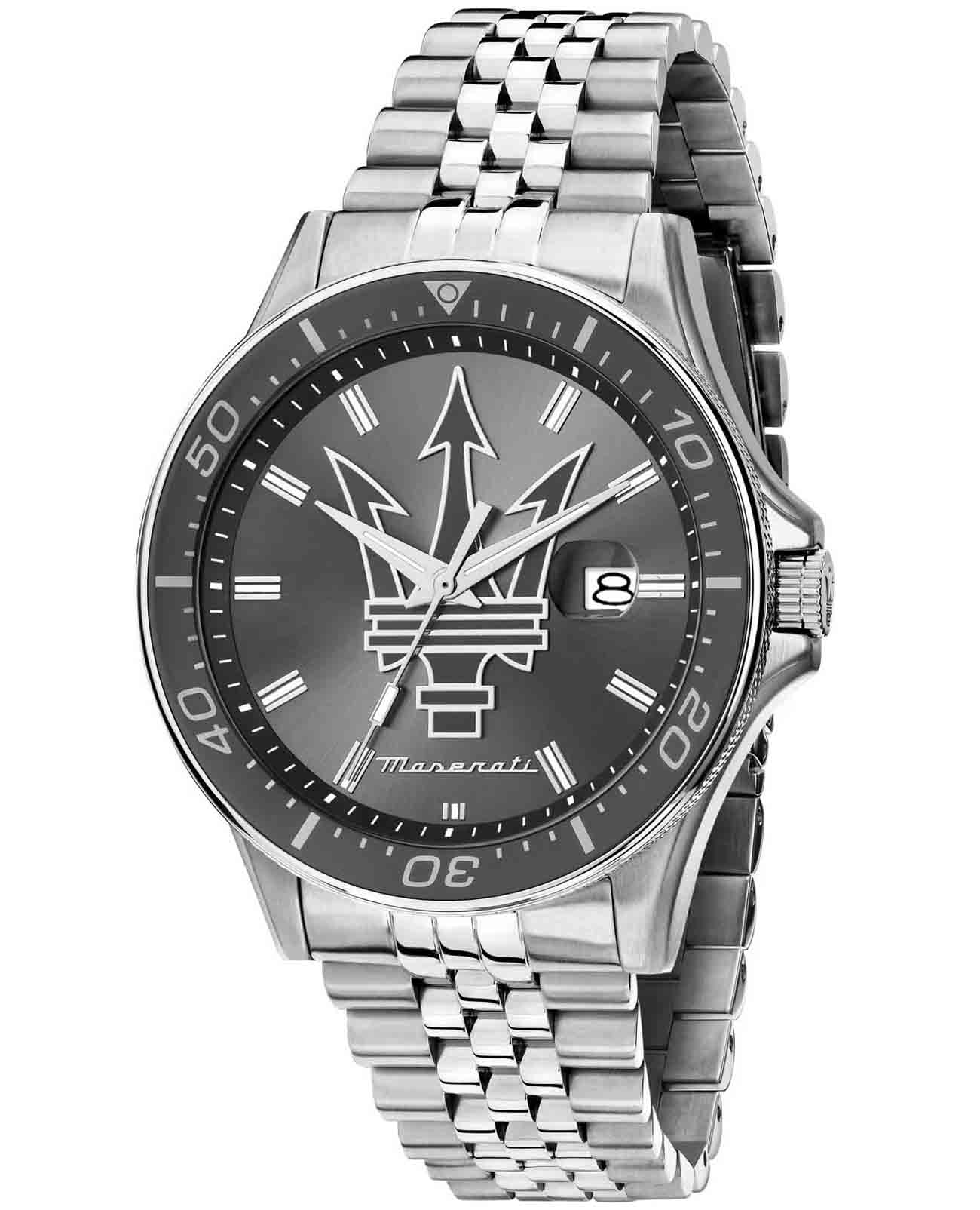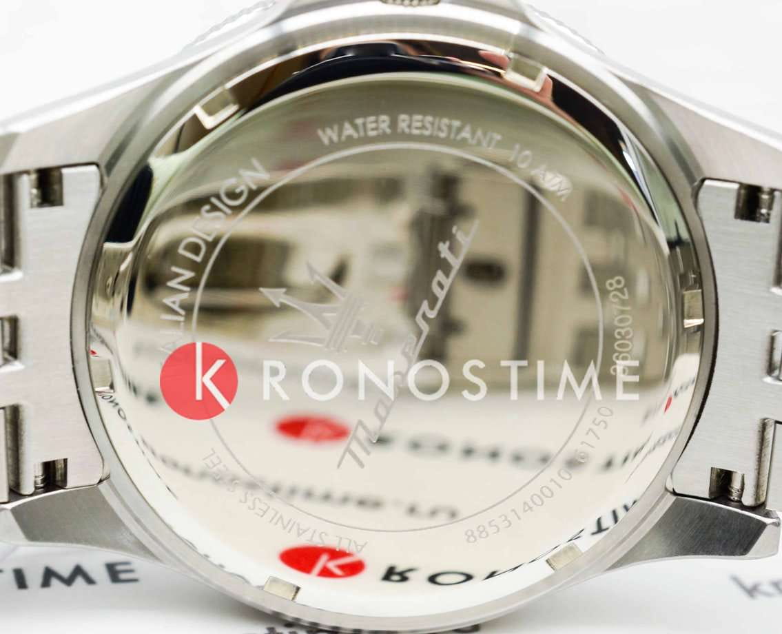 Модель Maserati Sfida R8853140010 — воплощение стиля и функциональности для современных мужчин, ценящих качество и элегантность. Корпус диаметром 44 мм выполнен из нержавеющей стали, обеспечивая прочность и долговечность. Минеральное стеклоМинеральное стеклоМинеральное стекло представляет собой искусственно выращенный минерал кварца. Такое стекло отличается особой устойчивостью к повреждениям и царапинам. Уступает по некоторым качествам сапфировому стеклу. надежно защищает синий циферблат с изящными рисками, придавая часам утонченный вид. Благодаря водостойкости до 100 метров (10 АТМ), эти часы станут вашим надежным спутником в любых условиях, будь то деловая встреча или активный отдых. Люминесцентное покрытиеЛюминесцентное покрытиеПозволяет считывать показания времени в темноте. Производители наносят на стрелки, часовые индексы, безель или поверхность циферблата светонакопительный состав, дающий холодное свечение. на стрелках и метках обеспечивает отличную видимость в темноте. Завершающий штрих — стальной браслет с раскладной застёжкойРаскладная застёжкаТакой тип застёжки используется только на браслетах из металла. Она никогда не раскрывается полностью, происходит разделение на 2 и более частей. Раскладывающая застёжка снизит вероятность потери часов к минимуму., который подчеркивает общий стиль, обеспечивая комфорт и надежность в носке. Вращающийся стальной безельБезельВнешний ободок, закрепляющий стекло. В спортивных часах так называется поворотное кольцо с делениями на циферблате, выполняет роль таймера – замеряет отрезки времени на шкале. Неподвижный безель – элемент декора. Однонаправленно вращающийся безель на дайверских часах позволяет фиксировать моменты погружения и выныривания на поверхность. с IP-покрытиемIP-покрытиеМетод ионного напыления. Демонстрирует повышенную устойчивость к истиранию, окислению и химическим веществам. Под воздействием высокого давления и температуры около 1500°C молекулы металла надёжно соединяются с частицами корпуса часов.. Циферблат выполнен по технологии Sunray (солнечные лучи) и украшен фирменным логотипом «Maserati». Метки в виде штрихов. Окошко даты с увеличительным стеклом находится в положении 3 часа.