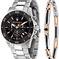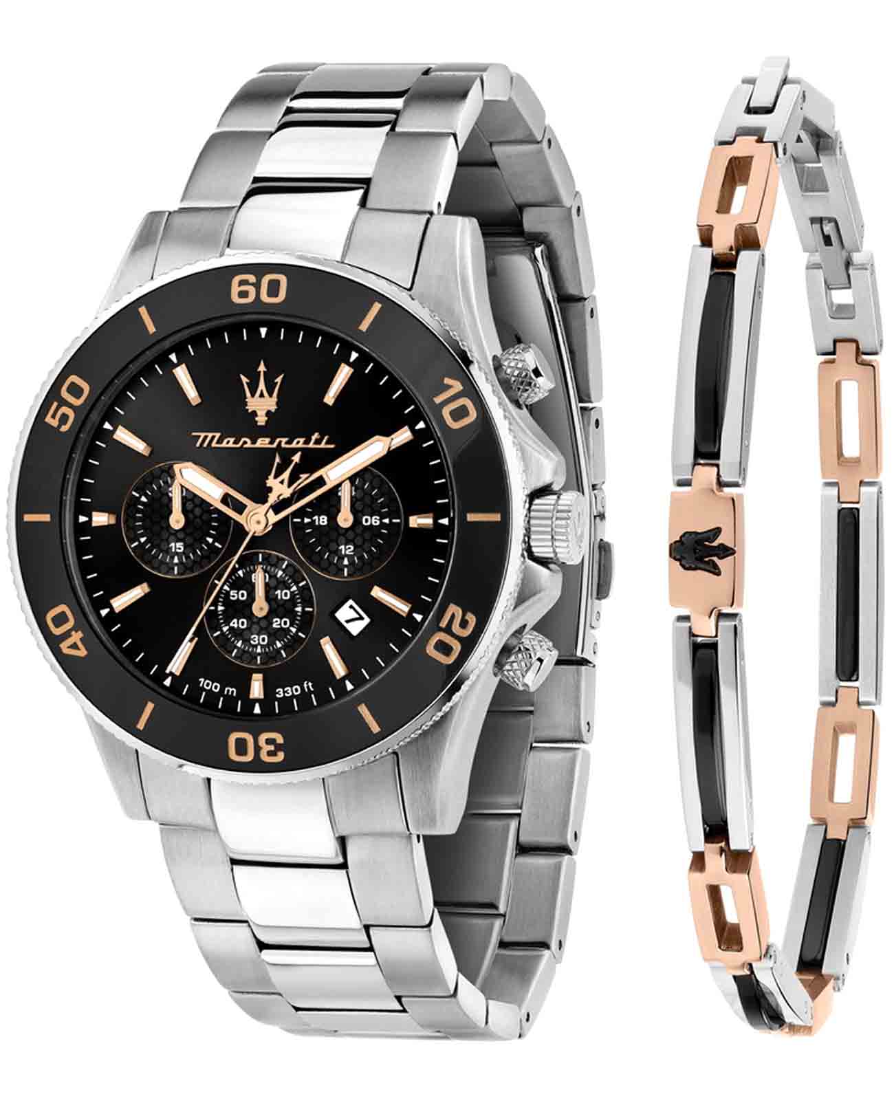 Мужские часы Maserati R8873600001 — это стильное сочетание элегантности и современного дизайна. Корпус из нержавеющей стали с диаметром 43 мм идеально сбалансирован и элегантен. Минеральное стеклоМинеральное стеклоМинеральное стекло представляет собой искусственно выращенный минерал кварца. Такое стекло отличается особой устойчивостью к повреждениям и царапинам. Уступает по некоторым качествам сапфировому стеклу. защищает циферблат от царапин. Стальной браслет на застёжке-бабочке с кнопкамиЗастёжка "бабочка"Такой вид застёжки дополняется предохранителями, помогающими избежать случайного раскрытия браслета. Обладают изящным исполнением. идеально дополняют дизайн часов, обеспечивая комфортное ношение. Стрелки и метки с люминесцентным покрытиемЛюминесцентное покрытиеПозволяет считывать показания времени в темноте. Производители наносят на стрелки, часовые индексы, безель или поверхность циферблата светонакопительный состав, дающий холодное свечение.. Керамический безельБезельВнешний ободок, закрепляющий стекло. В спортивных часах так называется поворотное кольцо с делениями на циферблате, выполняет роль таймера – замеряет отрезки времени на шкале. Неподвижный безель – элемент декора. Однонаправленно вращающийся безель на дайверских часах позволяет фиксировать моменты погружения и выныривания на поверхность.. Часы обладают впечатляющей водонепроницаемостью до 10 бар (100 метров), что делает их идеальными для повседневной носки. Метки в виде штрихов. Окошко даты с увеличительным стеклом находится в положении 3 часа. Данная модель идёт в комплекте с мужским браслетом из гипоаллергенной нержавеющей стали с PVD-покрытиемPVDУльтратонкое покрытие наносится в технике вакуумного напыления, сочетает в себе нитрид титана особой прочности со слоем золота или оксида хрома. Несёт в себе декоративную или защитную функцию. чёрного цвета и цвета розового золота.