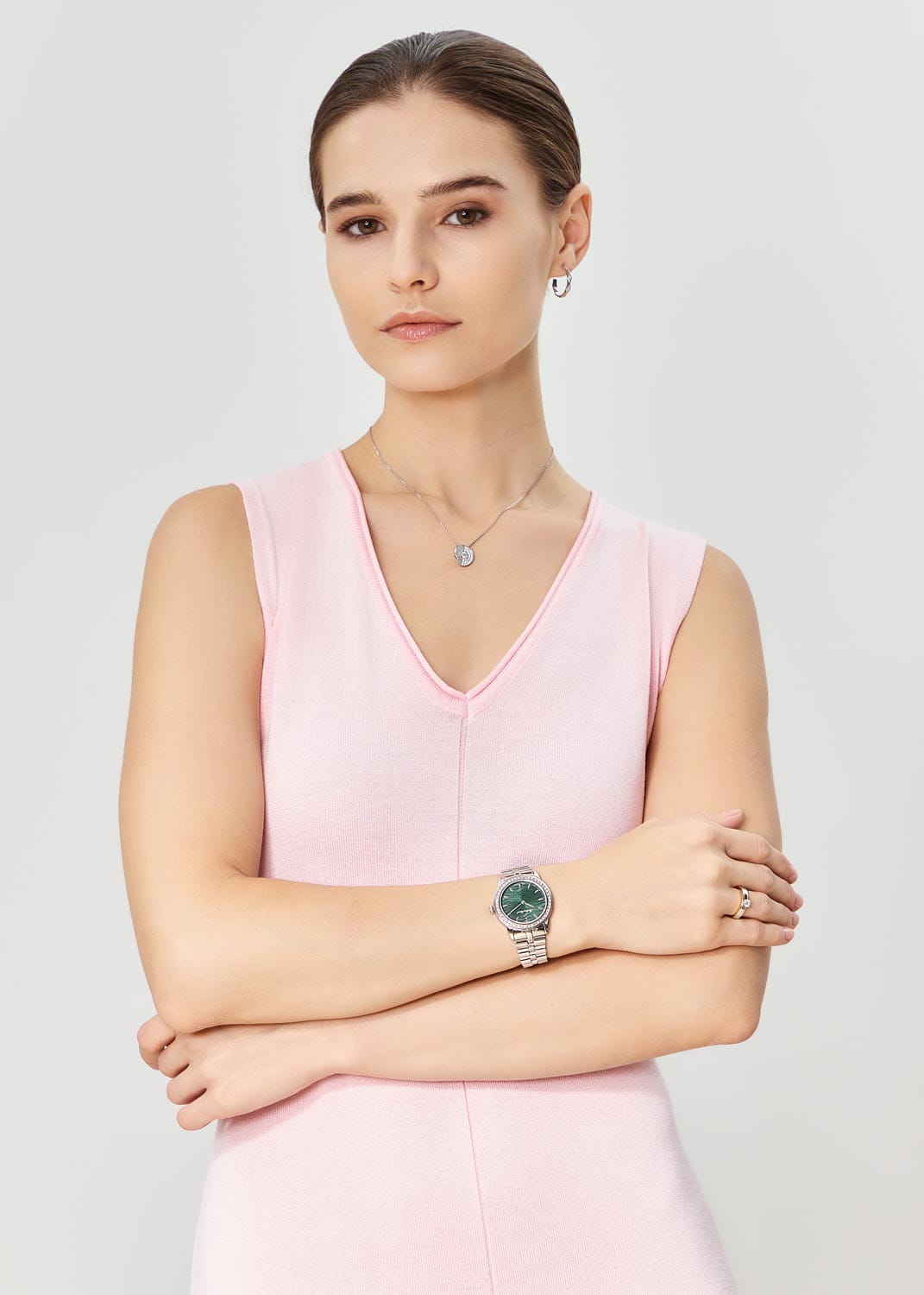 Женские кварцевые часы Mathey-Tissot Artemis D10860AQV — это стильное сочетание элегантности и современного дизайна. Изящный корпус выполнен из стали 316L с безелемБезельВнешний ободок, закрепляющий стекло. В спортивных часах так называется поворотное кольцо с делениями на циферблате, выполняет роль таймера – замеряет отрезки времени на шкале. Неподвижный безель – элемент декора. Однонаправленно вращающийся безель на дайверских часах позволяет фиксировать моменты погружения и выныривания на поверхность., украшенным кристаллами, что придаст образу женственности и романтизма. Изысканный циферблат с метками в виде штрихов придает модели особый блеск и защищен минеральным стекломМинеральное стеклоМинеральное стекло представляет собой искусственно выращенный минерал кварца. Такое стекло отличается особой устойчивостью к повреждениям и царапинам. Уступает по некоторым качествам сапфировому стеклу., обеспечивающим устойчивость к царапинам. Центральные часовая, минутная стрелки. Часы оснащены надежным кварцевым механизмом. Стальной браслет на застёжке-бабочке с кнопкамиЗастёжка "бабочка"Такой вид застёжки дополняется предохранителями, помогающими избежать случайного раскрытия браслета. Обладают изящным исполнением. , гарантирующего комфортное и безопасное ношение. Класс водозащиты: 50 метров позволит защитить корпус от случайных брызг или капель дождя. Mathey-Tissot — отличный выбор для тех, кто ценит утонченность и качество.