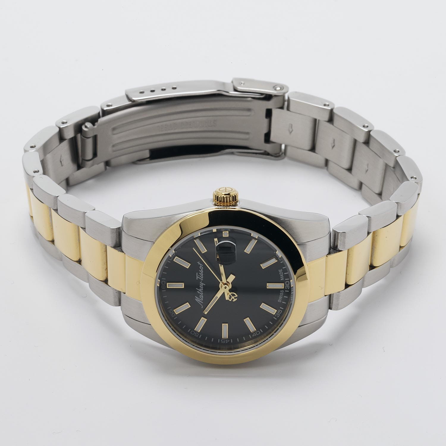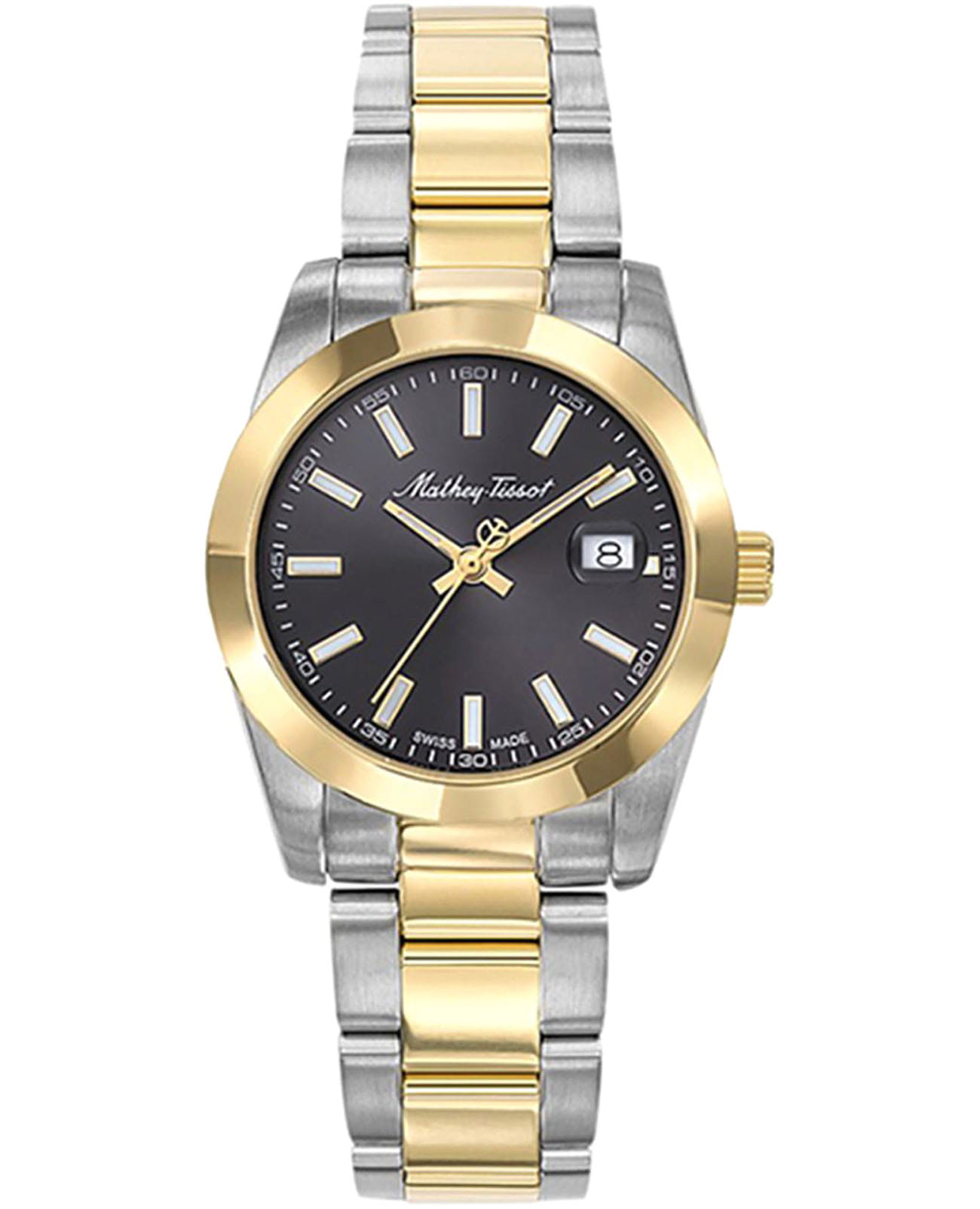 Женские кварцевые часы Mathey-Tissot Mathy D450BN — это стильное сочетание элегантности и современного дизайна. Изящный корпус выполнен из нержавеющей стали, диаметром 30 мм, что придаст образу женственности и романтизма. Изысканный циферблат с метками в виде штрихов придает модели особый блеск. Циферблат защищен минеральным стекломМинеральное стеклоМинеральное стекло представляет собой искусственно выращенный минерал кварца. Такое стекло отличается особой устойчивостью к повреждениям и царапинам. Уступает по некоторым качествам сапфировому стеклу., обеспечивающий устойчивость к царапинам. Стрелки и метки с люминесцентным покрытиемЛюминесцентное покрытиеПозволяет считывать показания времени в темноте. Производители наносят на стрелки, часовые индексы, безель или поверхность циферблата светонакопительный состав, дающий холодное свечение.. БезельБезельВнешний ободок, закрепляющий стекло. В спортивных часах так называется поворотное кольцо с делениями на циферблате, выполняет роль таймера – замеряет отрезки времени на шкале. Неподвижный безель – элемент декора. Однонаправленно вращающийся безель на дайверских часах позволяет фиксировать моменты погружения и выныривания на поверхность. с PVD-покрытиемPVDУльтратонкое покрытие наносится в технике вакуумного напыления, сочетает в себе нитрид титана особой прочности со слоем золота или оксида хрома. Несёт в себе декоративную или защитную функцию. золотистого цвета. Окошко даты находится в положении 3 часа. Часы оснащены надежным кварцевым механизмом. Стальной браслет с частичным PVD-покрытиемPVDУльтратонкое покрытие наносится в технике вакуумного напыления, сочетает в себе нитрид титана особой прочности со слоем золота или оксида хрома. Несёт в себе декоративную или защитную функцию. на раскладной застёжке с фиксаторомРаскладная застёжкаТакой тип застёжки используется только на браслетах из металла. Она никогда не раскрывается полностью, происходит разделение на 2 и более частей. Раскладывающая застёжка снизит вероятность потери часов к минимуму., гарантирует комфортное и безопасное ношение. Класс водозащиты: 50 метров позволит защитить корпус от случайных брызг или капель дождя. Mathey-Tissot  — отличный выбор для тех, кто ценит утонченность и качество.