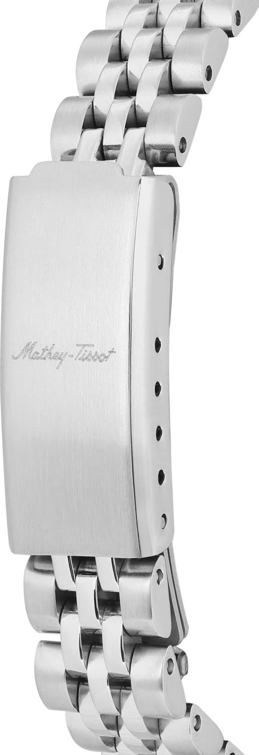 Женские кварцевые часы Mathey-Tissot Mathy D810AV — это стильное сочетание элегантности и современного дизайна. Изящный корпус выполнен из нержавеющей стали, диаметром 32 мм, что придаст образу женственности и романтизма. Изысканный циферблат с метками в виде точек украшены цирконами, что придает модели особый блеск. Циферблат защищен минеральным стекломМинеральное стеклоМинеральное стекло представляет собой искусственно выращенный минерал кварца. Такое стекло отличается особой устойчивостью к повреждениям и царапинам. Уступает по некоторым качествам сапфировому стеклу., обеспечивающий устойчивость к царапинам. Стрелки с люминесцентным покрытиемЛюминесцентное покрытиеПозволяет считывать показания времени в темноте. Производители наносят на стрелки, часовые индексы, безель или поверхность циферблата светонакопительный состав, дающий холодное свечение.. Окошко даты находится в положении 3 часа. Часы оснащены надежным кварцевым механизмом. Стальной браслет на раскладной застёжкеРаскладная застёжкаТакой тип застёжки используется только на браслетах из металла. Она никогда не раскрывается полностью, происходит разделение на 2 и более частей. Раскладывающая застёжка снизит вероятность потери часов к минимуму., гарантирует комфортное и безопасное ношение. Класс водозащиты: 50 метров позволит защитить корпус от случайных брызг или капель дождя. Mathey-Tissot  — отличный выбор для тех, кто ценит утонченность и качество.