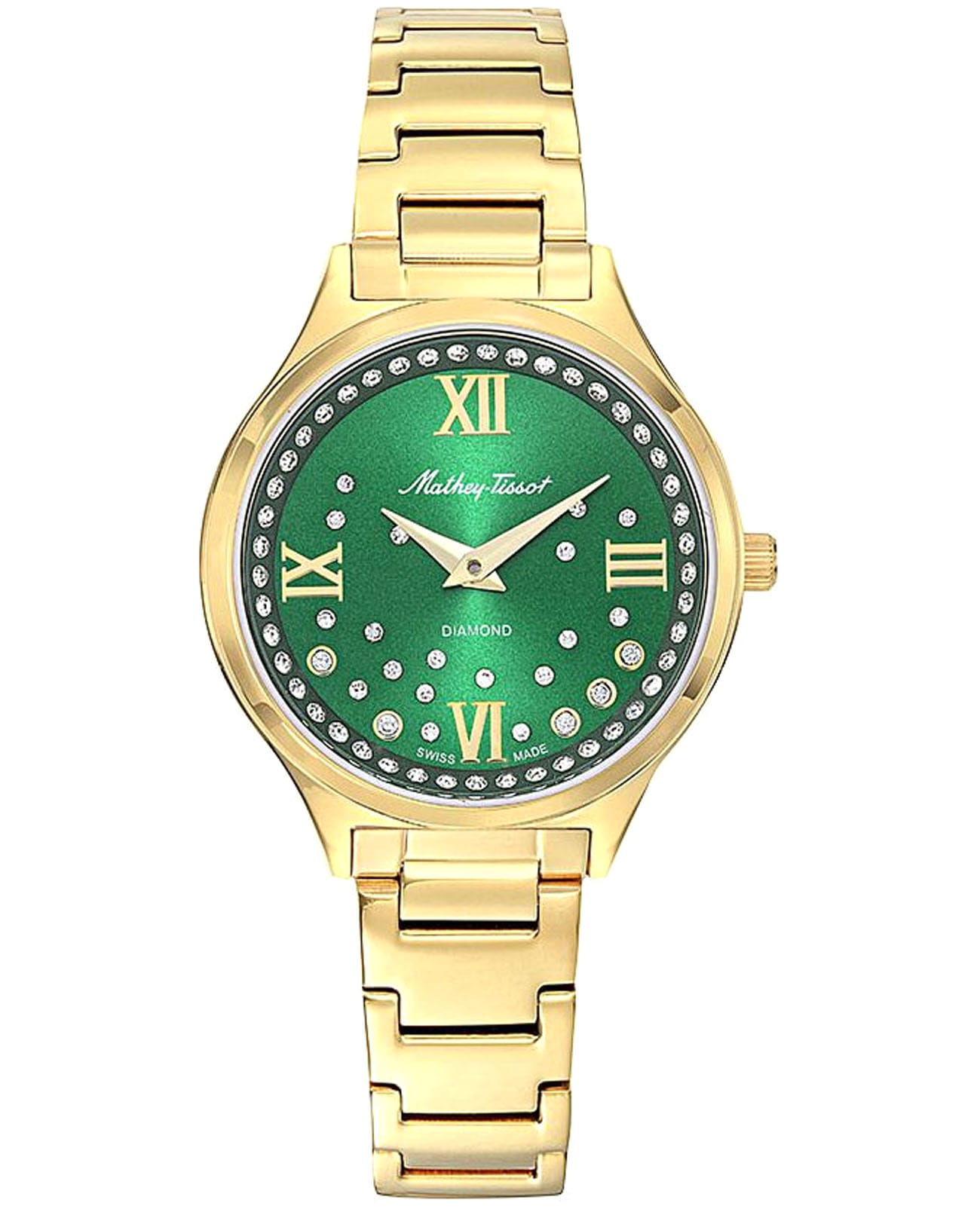 Женские кварцевые часы Mathey-Tissot Nicole D985SPYV — это стильное сочетание элегантности и современного дизайна. Изящный корпус выполнен из нержавеющей стали с PVD-покрытиемPVDУльтратонкое покрытие наносится в технике вакуумного напыления, сочетает в себе нитрид титана особой прочности со слоем золота или оксида хрома. Несёт в себе декоративную или защитную функцию. золотистого цвета, диаметром 32 мм, прекрасно впишется в ваш исключительный стиль. Изысканный циферблат с метками в виде римских цифр придает модели особый блеск и защищен сапфировым стекломСапфировое стеклоПрочный и надёжный материал из кристалла сапфира синтетического происхождения, характеризующийся особой твёрдостью и устойчивостью к царапинам и повреждениям., обеспечивающим устойчивость к царапинам. Циферблат украшен кристаллами. Мечевидные стрелки в стиле Dauphine. Часы оснащены надежным кварцевым механизмом. Рифленая заводная головка. Стальной браслет с PVD-покрытиемPVDУльтратонкое покрытие наносится в технике вакуумного напыления, сочетает в себе нитрид титана особой прочности со слоем золота или оксида хрома. Несёт в себе декоративную или защитную функцию. на застёжке-бабочке с кнопкамиЗастёжка "бабочка"Такой вид застёжки дополняется предохранителями, помогающими избежать случайного раскрытия браслета. Обладают изящным исполнением. гарантирует комфортное и безопасное ношение. Класс водозащиты: 50 метров позволит защитить корпус от случайных брызг или капель дождя. Mathey-Tissot  — отличный выбор для тех, кто ценит утонченность и качество.
