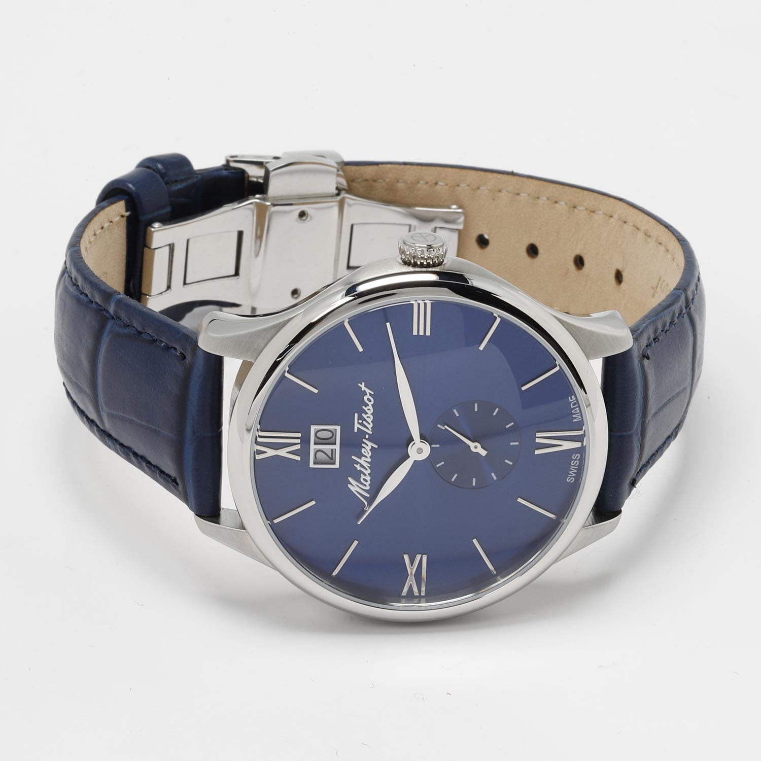 Мужские кварцевые часы Mathey-Tissot Edmond Quartz H1886QABU — это стильное сочетание элегантности и современного дизайна. Изящный корпус выполнен из нержавеющей стали, диаметром 42 мм, что придаст образу элегантности и надежности. Изысканный циферблат с метками в виде штрихов и римских цифр придает модели особый блеск. Циферблат защищен минеральным стекломМинеральное стеклоМинеральное стекло представляет собой искусственно выращенный минерал кварца. Такое стекло отличается особой устойчивостью к повреждениям и царапинам. Уступает по некоторым качествам сапфировому стеклу. с сапфировым покрытием, обеспечивает устойчивость к царапинам. Окошко даты находится в положении 12 часов. Кожаный ремешок с тиснением под кожу аллигатора на застёжке-бабочке с кнопкамиЗастёжка "бабочка"Такой вид застёжки дополняется предохранителями, помогающими избежать случайного раскрытия браслета. Обладают изящным исполнением. , гарантирует комфортное и безопасное ношение. Секундная стрелка вынесена на отдельный циферблат. Рифленая заводная головка. Класс водозащиты: 50 метров позволит защитить корпус от случайных брызг или капель дождя. Mathey-Tissot  — отличный выбор для тех, кто ценит утонченность и качество.