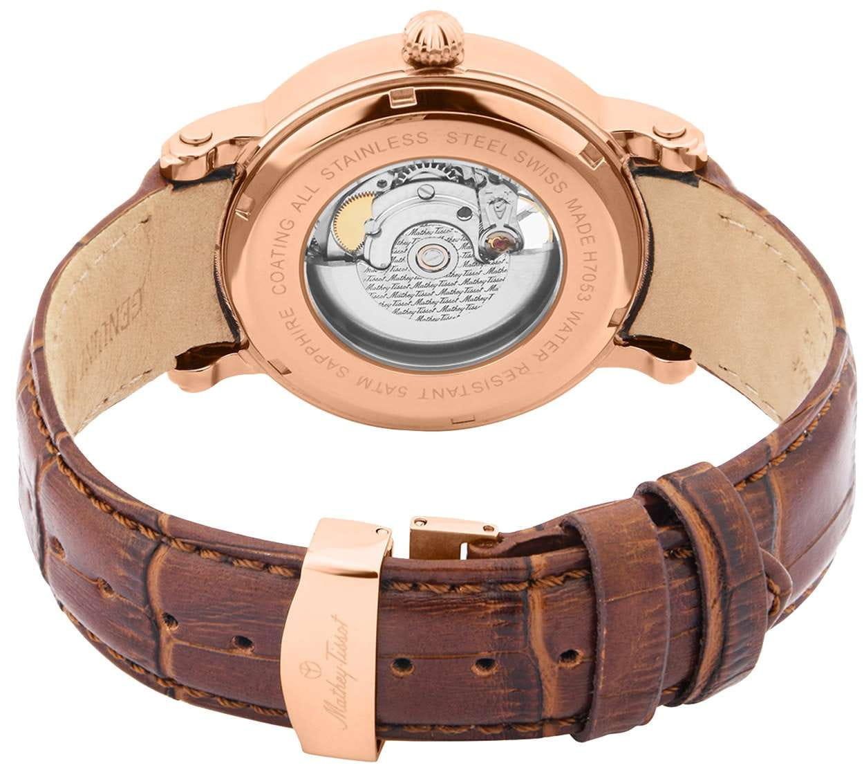Мужские механические часы с автоподзаводом Mathey-Tissot Mathy H7053PI — это стильное сочетание элегантности и современного дизайна. Изящный корпус выполнен из нержавеющей стали с PVD-покрытиемPVDУльтратонкое покрытие наносится в технике вакуумного напыления, сочетает в себе нитрид титана особой прочности со слоем золота или оксида хрома. Несёт в себе декоративную или защитную функцию., диаметром 42 мм, что придаст образу элегантности и надежности. Циферблат с метками в виде штрихов и римской цифры придает модели особый блеск. Циферблат защищен минеральным стекломМинеральное стеклоМинеральное стекло представляет собой искусственно выращенный минерал кварца. Такое стекло отличается особой устойчивостью к повреждениям и царапинам. Уступает по некоторым качествам сапфировому стеклу. с сапфировым покрытием, обеспечивает устойчивость к царапинам. Стрелки с люминесцентным покрытиемЛюминесцентное покрытиеПозволяет считывать показания времени в темноте. Производители наносят на стрелки, часовые индексы, безель или поверхность циферблата светонакопительный состав, дающий холодное свечение.. Кожаный ремешок с раскладной застёжкойРаскладная застёжкаТакой тип застёжки используется только на браслетах из металла. Она никогда не раскрывается полностью, происходит разделение на 2 и более частей. Раскладывающая застёжка снизит вероятность потери часов к минимуму. гарантирует комфортное и безопасное ношение. Класс водозащиты: 50 метров позволит защитить корпус от случайных брызг или капель дождя. Mathey-Tissot  — отличный выбор для тех, кто ценит утонченность и качество.