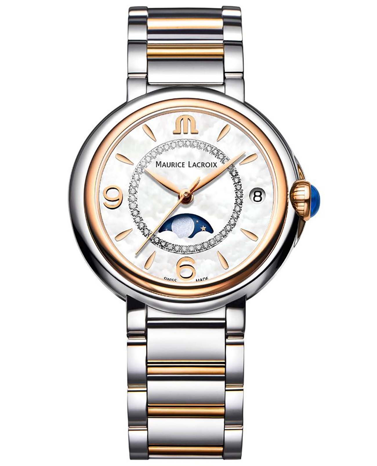 Женские швейцарские часы с бриллиантами Maurice Lacroix FIABA Date FA1084-PVP13-150-1, кварцевый механизм с высокой точностью. Сапфировое стекло устойчивое к появлению царапин, обладающее высокой прозрачностью. Класс водозащиты: 30 метров, позволит защитить корпус от случайных брызг или капель дождя. Корпус часов изготовлен из стали, разноцветного цвета.