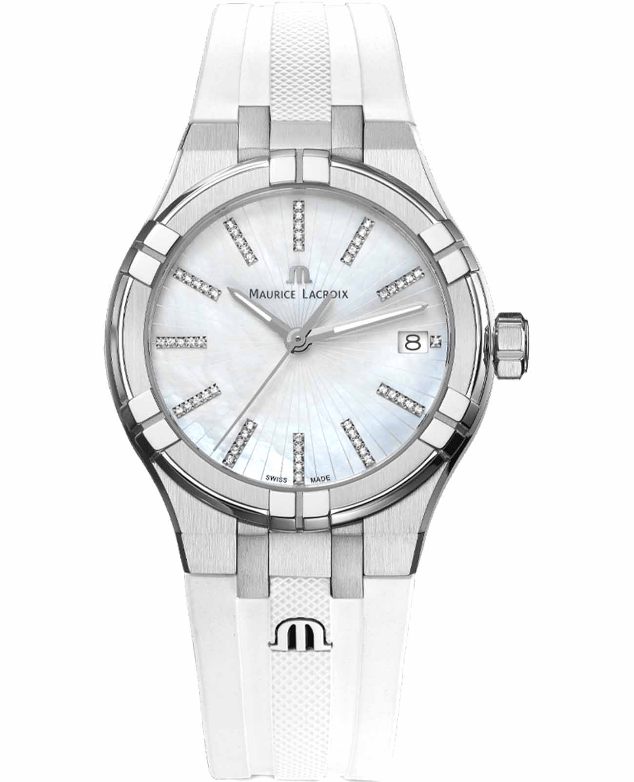 Швейцарские часы Maurice Lacroix Aikon AI1106-SS000-170-7, воплощающие современный стиль и безупречное швейцарское качество. Эти часы вдохновлены знаковой моделью Calypso из 90-х и представляют собой гармоничное сочетание смелого городского дизайна и мастерства исполнения. Корпус диаметром 35 мм выполнен из нержавеющей стали с изысканным сочетанием матовой и полированной отделки. Высота корпуса составляет всего 9 мм, что делает модель элегантной и удобной в ношении. Сапфировое стеклоСапфировое стеклоПрочный и надёжный материал из кристалла сапфира синтетического происхождения, характеризующийся особой твёрдостью и устойчивостью к царапинам и повреждениям. с двойным антибликовым покрытиемАнтибликовое покрытиеСлой оксида металла в 0,13-0,3 микрон, благодаря которому стекло часов не бликует и не отражает свет. Антибликовое покрытие уменьшает отражение света в 10 раз, обеспечивая отличную читаемость показателей циферблата. надежно защищает циферблат из белого перламутра, украшенного 56 бриллиантами. Часы также имеют заднюю крышку с особой гравировкой и безельБезельВнешний ободок, закрепляющий стекло. В спортивных часах так называется поворотное кольцо с делениями на циферблате, выполняет роль таймера – замеряет отрезки времени на шкале. Неподвижный безель – элемент декора. Однонаправленно вращающийся безель на дайверских часах позволяет фиксировать моменты погружения и выныривания на поверхность. с эффектным дизайном из шести "когтей". Стрелки с люминесцентным покрытиемЛюминесцентное покрытиеПозволяет считывать показания времени в темноте. Производители наносят на стрелки, часовые индексы, безель или поверхность циферблата светонакопительный состав, дающий холодное свечение., что облегчает чтение времени даже в условиях слабого освещения. На 3 часах расположено окошко с указателем даты. Часы оснащены кварцевым механизмом, обеспечивающим точный ход. Водостойкость до 10 ATM позволяет не беспокоиться о воздействии воды в повседневной жизни. Белый резиновый ремешок с логотипом Maurice Lacroix и классическая застежка из нержавеющей стали дополняют образ, а система легкой замены ремешка добавляет удобства.