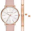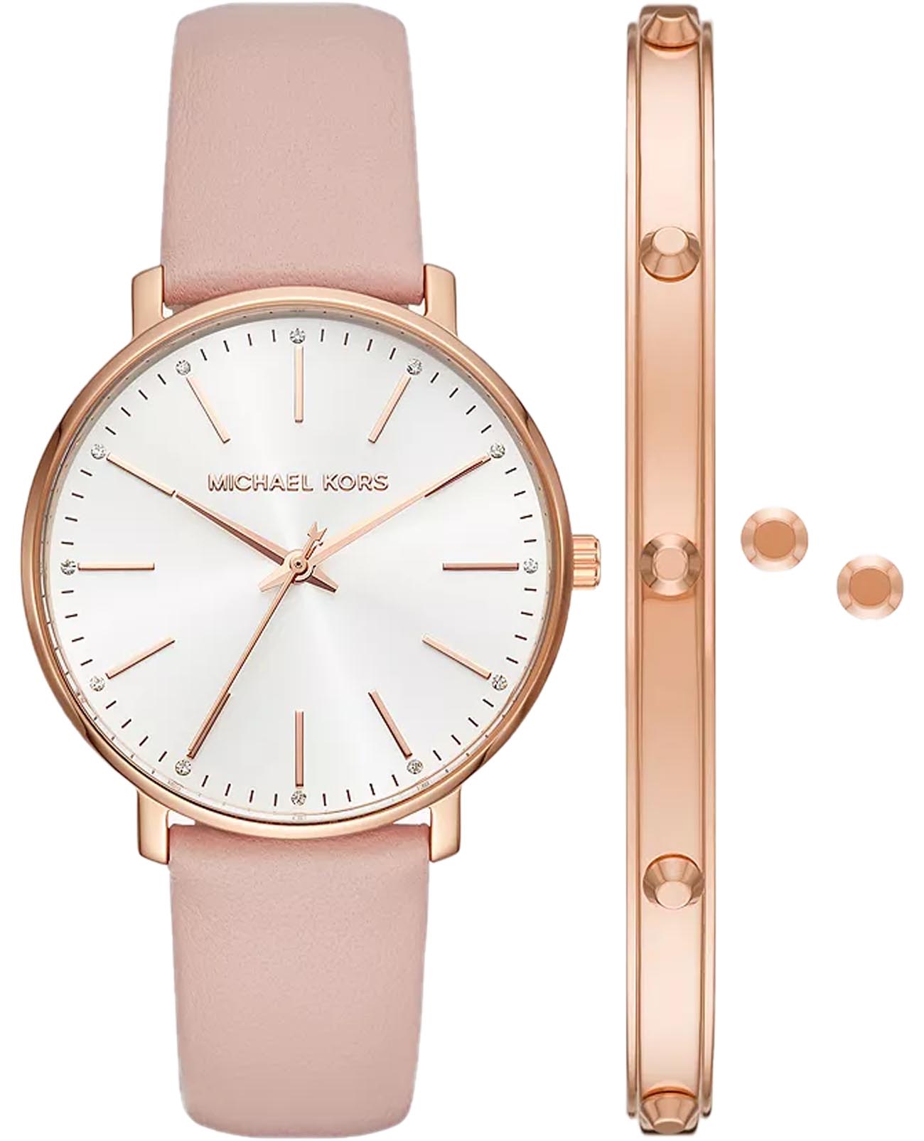 Женские часы Michael Kors Pyper MK1078SET, кварцевый механизм с высокой точностью. Минеральное стеклоМинеральное стеклоМинеральное стекло представляет собой искусственно выращенный минерал кварца. Такое стекло отличается особой устойчивостью к повреждениям и царапинам. Уступает по некоторым качествам сапфировому стеклу. устойчивое к появлению царапин, обладающее высокой прозрачностью. Корпус изготовлен из нержавеющей стали с IP-покрытиемIP-покрытиеМетод ионного напыления. Демонстрирует повышенную устойчивость к истиранию, окислению и химическим веществам. Под воздействием высокого давления и температуры около 1500°C молекулы металла надёжно соединяются с частицами корпуса часов.. Метки на цифебрлате с кристалами. Класс водозащиты: 50 метров, позволит защитить корпус от случайных брызг или капель дождя. Кожаный ремешок на раскладной застёжке. В комплекте с часами поставляется браслет и серьги.