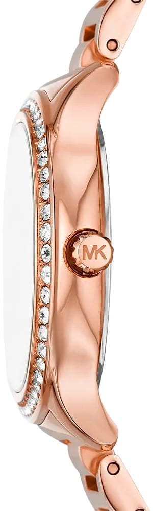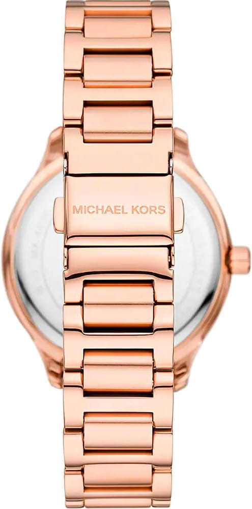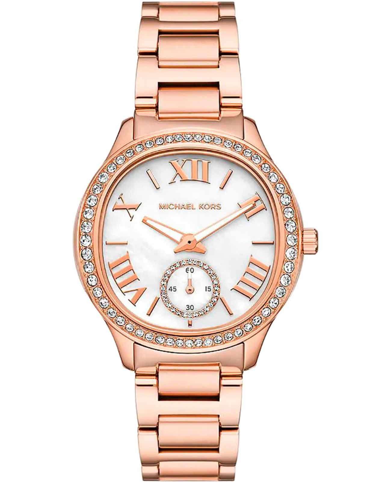 Эти часы — идеальный аксессуар, который придаст женскому образу завершенность и особый шарм. Женские американские часы Michael Kors Sage MK4806 имеют кварцевый механизм с высокой точностью. Корпус и браслет часов изготовлены из нержавеющей стали с розово-золотистым PVD-покрытиемPVDУльтратонкое покрытие наносится в технике вакуумного напыления, сочетает в себе нитрид титана особой прочности со слоем золота или оксида хрома. Несёт в себе декоративную или защитную функцию.. Перламутровый циферблат и безельБезельВнешний ободок, закрепляющий стекло. В спортивных часах так называется поворотное кольцо с делениями на циферблате, выполняет роль таймера – замеряет отрезки времени на шкале. Неподвижный безель – элемент декора. Однонаправленно вращающийся безель на дайверских часах позволяет фиксировать моменты погружения и выныривания на поверхность. украшены кристаллами. Циферблат с метками в виде римских цифр и штрихов защищен минеральным стекломМинеральное стеклоМинеральное стекло представляет собой искусственно выращенный минерал кварца. Такое стекло отличается особой устойчивостью к повреждениям и царапинам. Уступает по некоторым качествам сапфировому стеклу., что обеспечивает надежную защиту от царапин и повреждений. Секундная стрелка вынесена на отдельный циферблат, обрамленный кристаллами, что придает часам уникальный и стильный вид. Люминесцентное покрытиеЛюминесцентное покрытиеПозволяет считывать показания времени в темноте. Производители наносят на стрелки, часовые индексы, безель или поверхность циферблата светонакопительный состав, дающий холодное свечение. на стрелках обеспечивает отличную видимость в темноте. Класс водозащиты: 50 метров, позволит защитить корпус от случайных брызг или капель дождя. Стальной браслет с розово-золотистым PVD-покрытиемPVDУльтратонкое покрытие наносится в технике вакуумного напыления, сочетает в себе нитрид титана особой прочности со слоем золота или оксида хрома. Несёт в себе декоративную или защитную функцию. на раскладной застёжкеРаскладная застёжкаТакой тип застёжки используется только на браслетах из металла. Она никогда не раскрывается полностью, происходит разделение на 2 и более частей. Раскладывающая застёжка снизит вероятность потери часов к минимуму. обеспечивает надежную фиксацию на запястье и легкость в надевании и снятии. Эти часы станут отличным дополнением к любому наряду, подчеркивая индивидуальность и стиль их обладательницы.