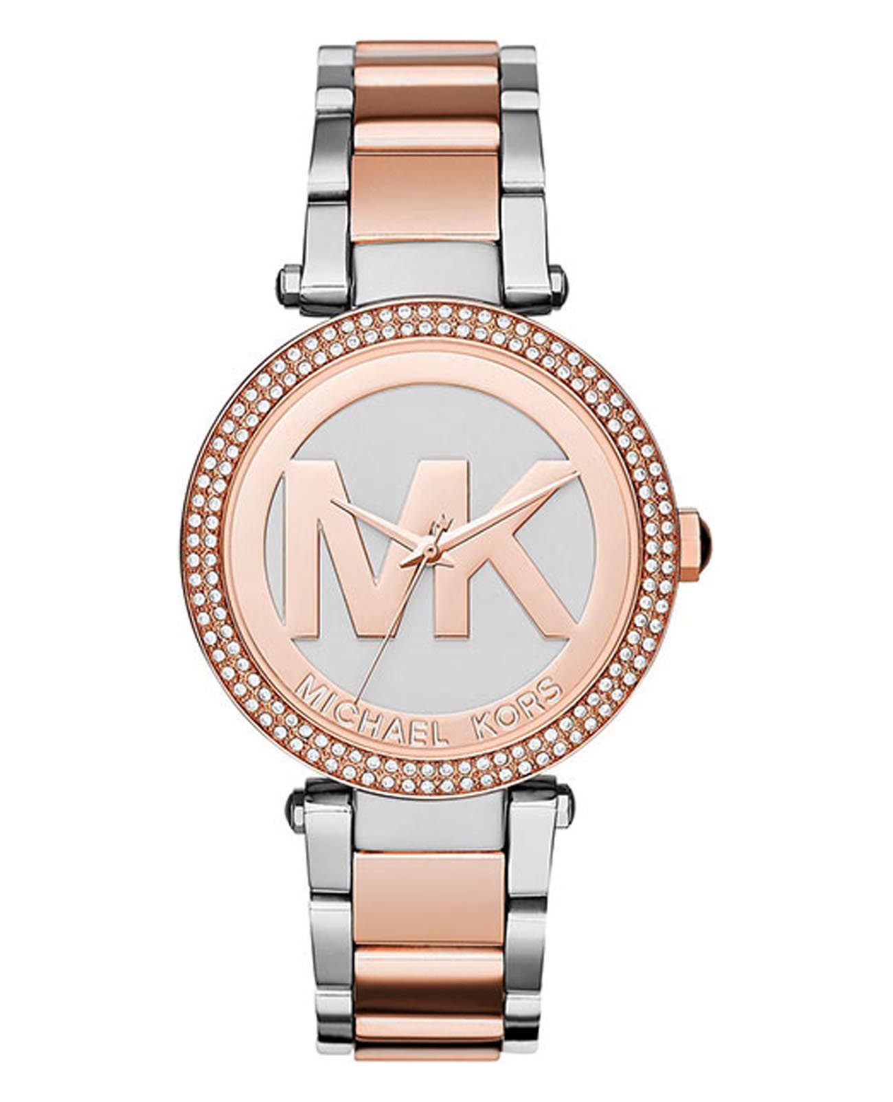 Женские американские часы с минеральным стекломМинеральное стеклоМинеральное стекло представляет собой искусственно выращенный минерал кварца. Такое стекло отличается особой устойчивостью к повреждениям и царапинам. Уступает по некоторым качествам сапфировому стеклу. Michael Kors Parker MK6314, кварцевый механизм с высокой точностью. Корпус часов изготовлен из нержавеющей стали. БезельБезельВнешний ободок, закрепляющий стекло. В спортивных часах так называется поворотное кольцо с делениями на циферблате, выполняет роль таймера – замеряет отрезки времени на шкале. Неподвижный безель – элемент декора. Однонаправленно вращающийся безель на дайверских часах позволяет фиксировать моменты погружения и выныривания на поверхность. с PVD-покрытиемPVDУльтратонкое покрытие наносится в технике вакуумного напыления, сочетает в себе нитрид титана особой прочности со слоем золота или оксида хрома. Несёт в себе декоративную или защитную функцию. украшен кристаллами. Класс водозащиты: 50 метров, позволит защитить корпус от случайных брызг или капель дождя. Стальной браслет с частичным PVD-покрытиемPVDУльтратонкое покрытие наносится в технике вакуумного напыления, сочетает в себе нитрид титана особой прочности со слоем золота или оксида хрома. Несёт в себе декоративную или защитную функцию. на раскладной застёжкеРаскладная застёжкаТакой тип застёжки используется только на браслетах из металла. Она никогда не раскрывается полностью, происходит разделение на 2 и более частей. Раскладывающая застёжка снизит вероятность потери часов к минимуму..