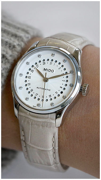 Женские швейцарские механические часы с системой автоматического подзавода Mido Belluna M024.207.16.036.00, механический механизм (автоматический калибр) с высокой точностью. Сапфировое стеклоСапфировое стеклоПрочный и надёжный материал из кристалла сапфира синтетического происхождения, характеризующийся особой твёрдостью и устойчивостью к царапинам и повреждениям. устойчивое к появлению царапин, обладающее высокой прозрачностью. Класс водозащиты: 50 метров, позволит защитить корпус от случайных брызг или капель дождя. Корпус часов изготовлен из стали. Шикарная классика в стильном исполнении. Бриллианты вместо разметки. Циферблат выполнен с расходящимся гильоше волнами. Индикация даты выполнена в виде апертуры.